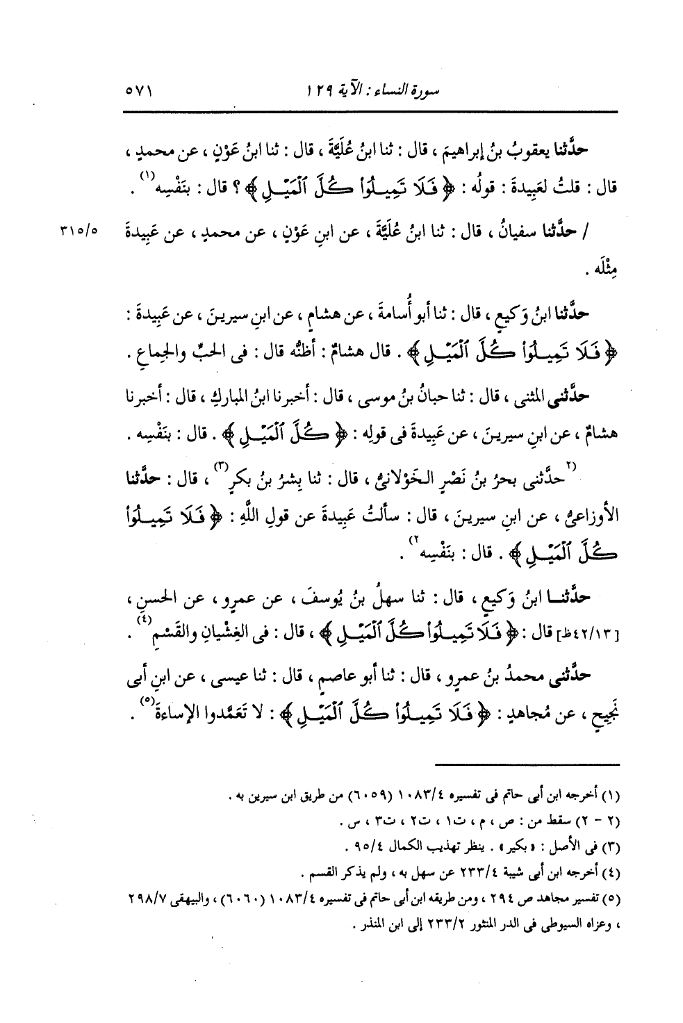 حَدَّثَنَا يَعْقُوبُ بْنُ إِبْرَاهِيمَ , قَالَ: ثنا ابْنُ عُلَيَّةَ , قَالَ: ثنا ابْنُ عَوْنٍ , عَنْ مُحَمَّدٍ , قَالَ: قُلْتُ لِعَبِيدَةَ: {§فَلَا تَمِيلُوا كُلَّ الْمَيْلِ} [النساء: 129] قَالَ: «بِنَفْسِهِ» حَدَّثَنَا سُفْيَانُ , قَالَ: ثنا ابْنُ عُلَيَّةَ , عَنِ ابْنِ عَوْنٍ , عَنْ مُحَمَّدٍ , عَنْ عُبَيْدَةَ , مِثْلَهُ