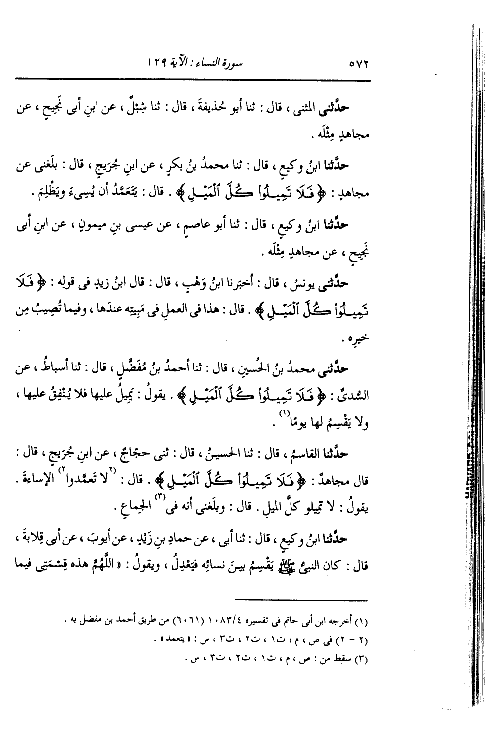 حَدَّثَنَا الْقَاسِمُ , قَالَ: ثنا الْحُسَيْنُ , قَالَ: ثني حَجَّاجٌ , عَنِ ابْنِ جُرَيْجٍ , قَالَ: قَالَ مُجَاهِدٌ: {§فَلَا تَمِيلُوا كُلَّ الْمَيْلِ} [النساء: 129] قَالَ: " يَتَعَمَّدُ الْإِسَاءَةَ , يَقُولُ: لَا تَمِيلُوا كُلَّ الْمَيْلِ , قَالَ: بَلَغَنِي أَنَّهُ الْجِمَاعُ "