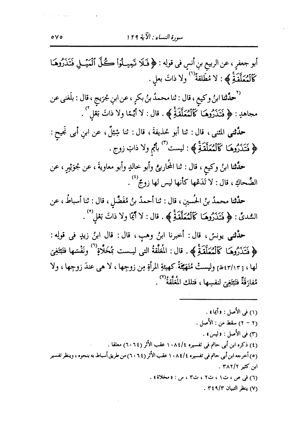 حَدَّثَنَا مُحَمَّدُ بْنُ الْحُسَيْنِ , قَالَ: ثنا أَحْمَدُ بْنُ مُفَضَّلٍ , قَالَ: ثنا أَسْبَاطٌ , عَنِ السُّدِّيِّ: {§فَتَذَرُوهَا كَالْمُعَلَّقَةِ} [النساء: 129] قَالَ: «لَا أَيِّمًا , وَلَا ذَاتَ بَعْلٍ»