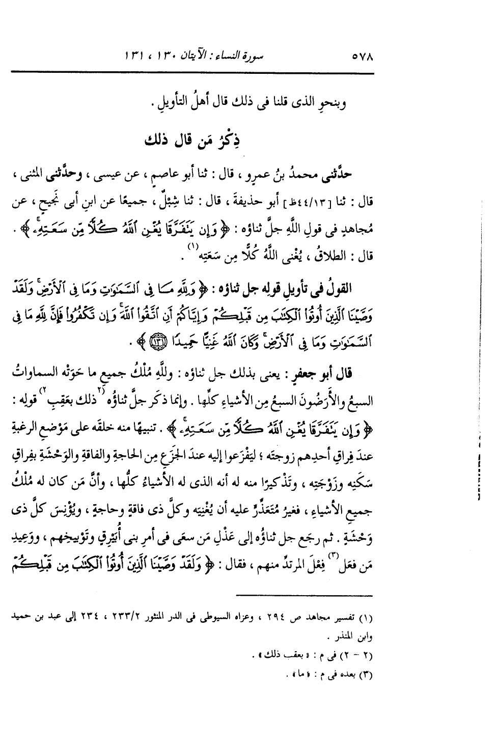 ذِكْرُ مَنْ قَالَ ذَلِكَ: حَدَّثَنِي مُحَمَّدُ بْنُ عَمْرٍو , قَالَ: ثنا أَبُو عَاصِمٍ , عَنْ عِيسَى , عَنِ ابْنِ أَبِي نَجِيحٍ , عَنْ مُجَاهِدٍ , فِي قَوْلِ اللَّهِ: {§وَإِنْ يَتَفَرَّقَا يُغْنِ اللَّهُ كُلًّا مِنْ سَعَتِهِ} [النساء: 130] قَالَ: «الطَّلَاقُ يُغْنِي اللَّهُ كُلًّا مِنْ سَعَتِهِ» حَدَّثَنِي الْمُثَنَّى , قَالَ: ثنا أَبُو حُذَيْفَةَ , قَالَ: ثنا شِبْلٌ , عَنِ ابْنِ أَبِي نَجِيحٍ , عَنْ مُجَاهِدٍ , مِثْلَهُ