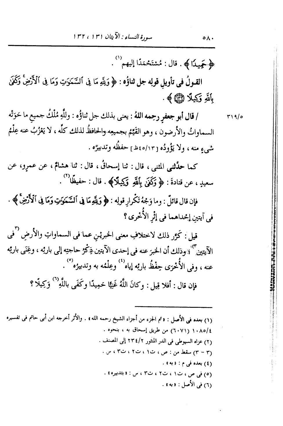 حَدَّثَنِي الْمُثَنَّى , قَالَ: ثنا إِسْحَاقُ , قَالَ: ثنا هِشَامٌ , عَنْ عَمْرٍو , عَنْ سَعِيدٍ , عَنْ قَتَادَةَ: {§وَكَفَى بِاللَّهِ وَكِيلًا} [النساء: 81] قَالَ: «حَفِيظًا» فَإِنْ قَالَ قَائِلٌ: وَمَا وَجْهُ تَكْرَارِ قَوْلِهِ: {وَلِلَّهِ مَا فِي السَّمَوَاتِ وَمَا فِي الْأَرْضِ} فِي آيَتَيْنِ إِحْدَاهُمَا فِي إِثْرِ الْأُخْرَى؟ قِيلَ: كَرَّرَ ذَلِكَ لِاخْتِلَافِ مَعْنَى الْخَبَرَيْنِ عَمَّا فِي السَّمَوَاتِ وَالْأَرْضِ فِي الْآيَتَيْنِ , وَذَلِكَ أَنَّ الْخَبَرَ عَنْهُ فِي إِحْدَى الْآيَتَيْنِ ذَكَرَ حَاجَتَهُ إِلَى بَارِئِهِ وَغِنَى بَارِئِهِ عَنْهُ , وَفِي الْأُخْرَى حِفْظَ بَارِئِهِ إِيَّاهُ بِهِ وَعِلْمَهُ بِهِ وَتَدْبِيرَهُ. فَإِنْ قَالَ: أَفَلَا قِيلَ: وَكَانَ اللَّهُ غَنِيًّا حَمِيدًا وَكَفَى بِاللَّهِ وَكِيلًا؟