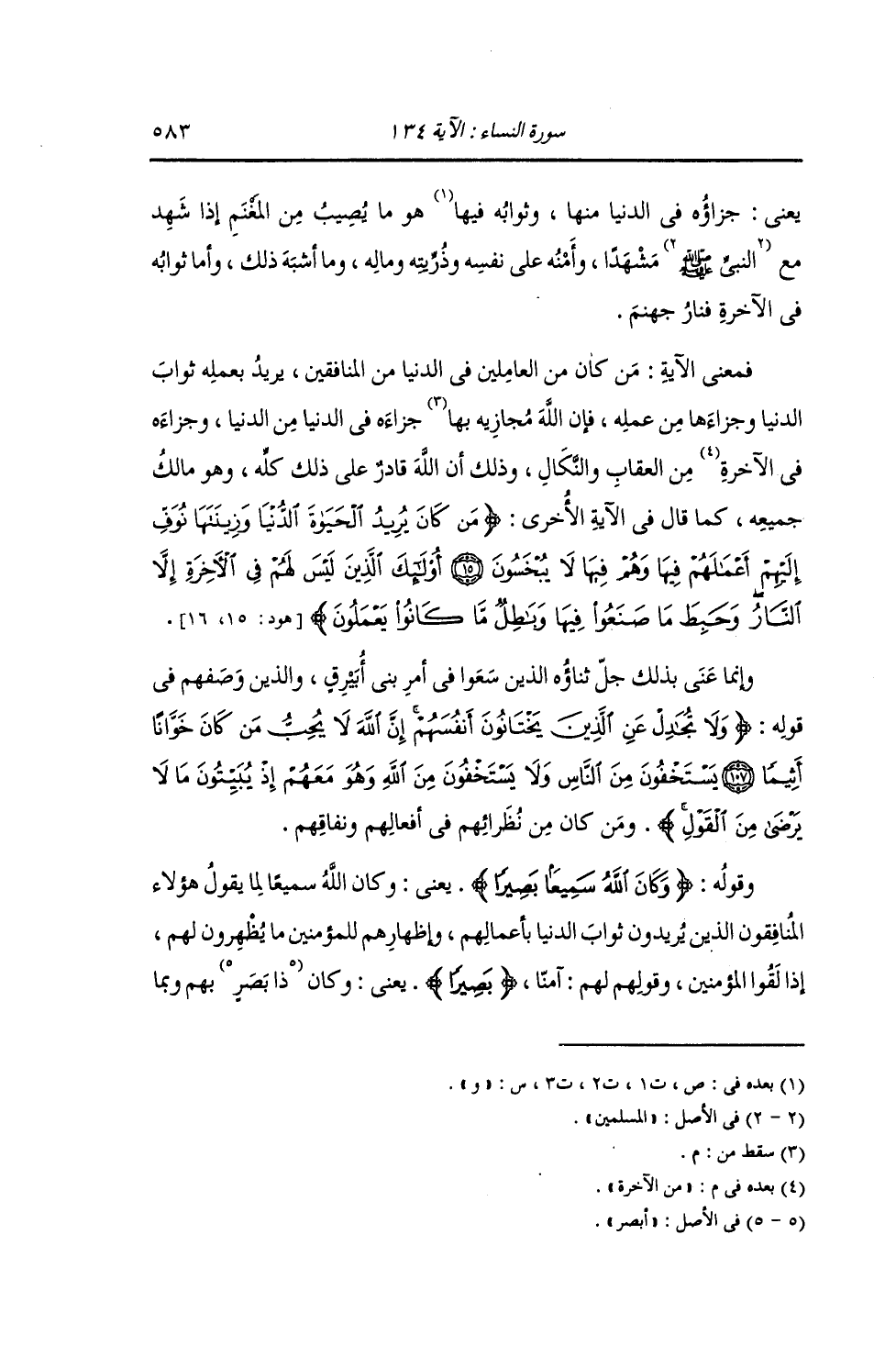 يَعْنِي: جَزَاؤُهُ فِي الدُّنْيَا مِنْهَا وَثَوَابُهُ فِيهَا , هُوَ مَا يُصِيبُ مِنَ الْمَغْنَمِ إِذَا شَهِدَ مَعَ النَّبِيِّ مَشْهَدًا , وَأَمَّنَهُ عَلَى نَفْسِهِ وَذُرِّيَّتِهِ وَمَالِهِ , وَمَا أَشْبَهَ ذَلِكَ. وَأَمَّا ثَوَابُهُ فِي الْآخِرَةِ فَنَارُ جَهَنَّمَ. فَمَعْنَى الْآيَةِ: مَنْ كَانَ مِنَ الْعَامِلِينَ فِي الدُّنْيَا مِنَ الْمُنَافِقِينَ يُرِيدُ بِعَمَلِهِ ثَوَابَ الدُّنْيَا وَجَزَاءَهَا مِنْ عَمَلِهِ , فَإِنَّ اللَّهَ مُجَازِيهِ جَزَاءَهُ فِي الدُّنْيَا مِنَ الدُّنْيَا , وَجَزَاءَهُ فِي الْآخِرَةِ مِنَ الْعِقَابِ وَالنَّكَالِ وَذَلِكَ أَنَّ اللَّهَ قَادِرٌ عَلَى ذَلِكَ كُلِّهِ , وَهُوَ مَالِكٌ جَمِيعَهُ , كَمَا قَالَ فِي الْآيَةِ الْأُخْرَى: {مَنْ كَانَ يُرِيدُ الْحَيَاةَ الدُّنْيَا وَزِينَتَهَا نُوَفِّ إِلَيْهِمْ أَعْمَالَهُمْ فِيهَا وَهُمْ فِيهَا لَا يُبْخَسُونَ أُولَئِكَ الَّذِينَ لَيْسَ لَهُمْ فِي الْآخِرَةِ إِلَّا النَّارُ وَحَبِطَ مَا صَنَعُوا فِيهَا وَبَاطِلٌ مَا كَانُوا يَعْمَلُونَ} [هود: 16] . وَإِنَّمَا عَنَى بِذَلِكَ جَلَّ ثَنَاؤُهُ الَّذِينَ سَعَوْا فِي أَمْرِ بَنِي أُبَيْرِقٍ , وَالَّذِينَ وَصَفَهُمْ فِي قَوْلِهِ: {وَلَا تُجَادِلْ عَنِ الَّذِينَ يَخْتَانُونَ أَنْفُسَهُمْ إِنَّ اللَّهَ لَا يُحِبُّ مَنْ كَانَ خَوَّانًا أَثِيمًا يَسْتَخْفُونَ مِنَ النَّاسِ وَلَا يَسْتَخْفُونَ مِنَ اللَّهِ وَهُوَ مَعَهُمْ إِذْ يُبَيِّتُونَ مَا لَا يَرْضَى مِنَ الْقَوْلِ} [النساء: 107] وَمَنْ كَانَ مِنْ نُظَرَائِهِمْ فِي أَفْعَالِهِمْ وَنِفَاقِهِمْ. وَقَوْلُهُ: {وَكَانَ اللَّهُ سَمِيعًا بَصِيرًا} [النساء: 134] يَعْنِي: وَكَانَ اللَّهُ سَمِيعًا لِمَا يَقُولُ هَؤُلَاءِ الْمُنَافِقُونَ الَّذِينَ يُرِيدُونَ ثَوَابَ الدُّنْيَا بِأَعْمَالِهِمْ , وَإِظْهَارِهِمْ لِلْمُؤْمِنِينَ مَا يُظْهِرُونَ لَهُمْ إِذَا لَقُوا الْمُؤْمِنِينَ وَقَوْلِهِمْ لَهُمْ آمَنَّا. {بَصِيرًا} [النساء: 58] يَعْنِي: وَكَانَ ذَا بَصَرٍ بِهِمْ وَبِمَا