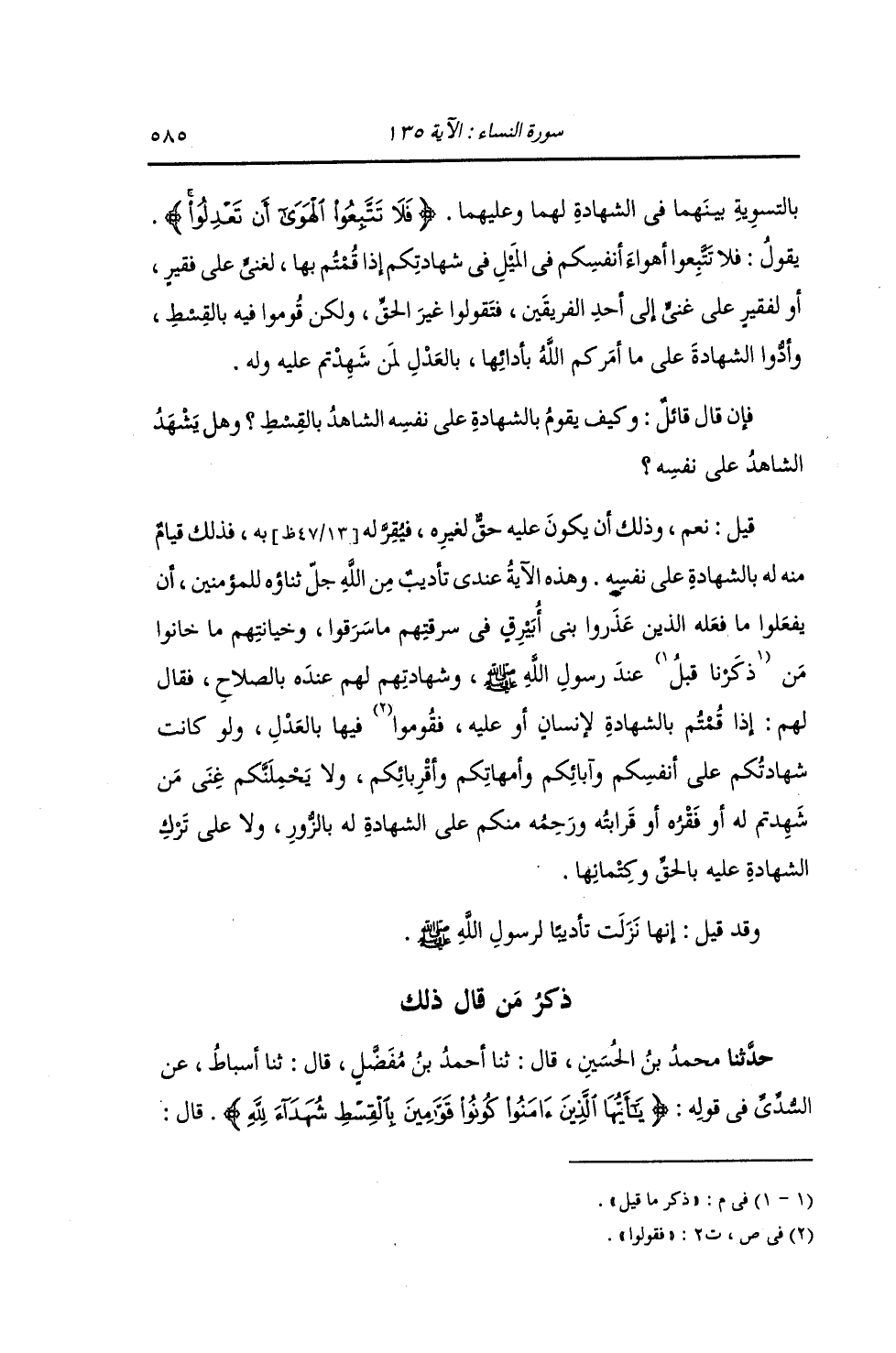 ذِكْرُ مَنْ قَالَ ذَلِكَ: حَدَّثَنَا مُحَمَّدُ بْنُ حُسَيْنٍ , قَالَ: ثنا أَحْمَدُ بْنُ مُفَضَّلٍ , قَالَ: ثنا أَسْبَاطٌ , عَنِ السُّدِّيِّ , فِي قَوْلِهِ: {§يَا أَيُّهَا الَّذِينَ آمَنُوا كُونُوا قَوَّامِينَ بِالْقِسْطِ شُهَدَاءَ لِلَّهِ} [النساء: 135] قَالَ: " -[586]- نَزَلَتْ فِي النَّبِيِّ صَلَّى اللهُ عَلَيْهِ وَسَلَّمَ , وَاخْتَصَمَ إِلَيْهِ رَجُلَانِ غَنِيُّ وَفَقِيرٌ , وَكَانَ ضِلْعُهُ مَعَ الْفَقِيرِ , يَرَى أَنَّ الْفَقِيرَ لَا يَظْلِمُ الْغَنِيَّ , فَأَبَى اللَّهُ إِلَّا أَنْ يَقُومَ بِالْقِسْطِ فِي الْغَنِيِّ وَالْفَقِيرِ , فَقَالَ: {إِنْ يَكُنْ غَنِيًّا أَوْ فَقِيرًا فَاللَّهُ أَوْلَى بِهِمَا فَلَا تَتَّبِعُوا الْهَوَى أَنْ تَعْدِلُوا} [النساء: 135] الْآيَةُ " وَقَالَ آخَرُونَ فِي ذَلِكَ نَحْوَ قَوْلِنَا إِنَّهَا نَزَلَتْ فِي الشَّهَادَةِ أَمْرًا مِنَ اللَّهِ الْمُؤْمِنِينَ أَنْ يُسَوُّوا فِي قِيَامِهِمْ بِشَهَادَاتِهِمْ لِمَنْ قَامُوا بِهَا بَيْنَ الْغَنِيِّ وَالْفَقِيرِ