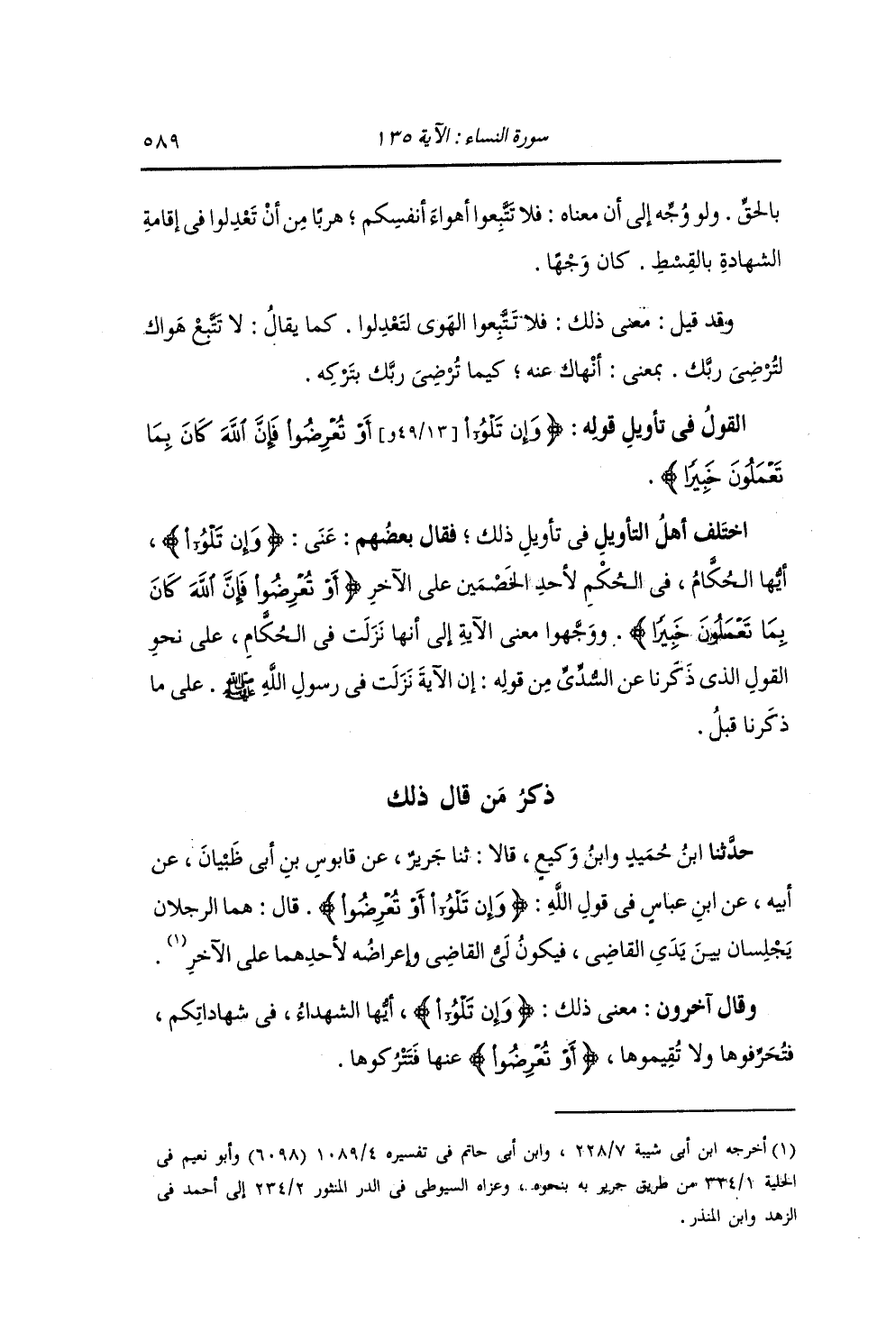 ذِكْرُ مَنْ قَالَ ذَلِكَ: حَدَّثَنَا ابْنُ حُمَيْدٍ , وَابْنُ وَكِيعٍ , قَالَا: ثنا جَرِيرٌ , عَنْ قَابُوسَ بْنِ أَبِي ظَبْيَانَ , عَنْ أَبِيهِ , عَنِ ابْنِ عَبَّاسٍ , فِي قَوْلِ اللَّهِ: {§وَإِنْ تَلْوُوا أَوْ تُعْرِضُوا} [النساء: 135] قَالَ: «هُمَا الرَّجُلَانِ يَجْلِسَانِ بَيْنَ يَدَيِ الْقَاضِي , فَيَكُونُ لَيُّ الْقَاضِي وَإِعْرَاضُهُ لِأَحَدِهِمَا عَلَى الْآخَرِ» وَقَالَ آخَرُونَ: مَعْنَى ذَلِكَ: وَإِنْ تَلْوُوا أَيُّهَا الشُّهَدَاءُ فِي شَهَادَاتِكُمْ فَتُحَرِّفُوهَا وَلَا تُقِيمُوهَا , أَوْ تُعْرِضُوا عَنْهَا فَتَتْرُكُوهَا