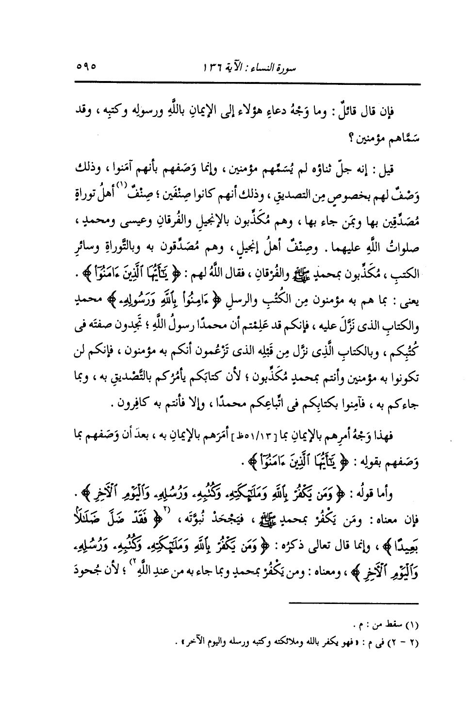 فَإِنْ قَالَ قَائِلٌ: وَمَا وَجْهُ دُعَاءِ هَؤُلَاءِ إِلَى الْإِيمَانِ بِاللَّهِ وَرَسُولِهِ وَكُتُبِهِ وَقَدْ سَمَّاهُمْ مُؤْمِنِينَ؟ قِيلَ: إِنَّهُ جَلَّ ثَنَاؤُهُ لَمْ يُسَمِّهِمْ مُؤْمِنِينَ , وَإِنَّمَا وَصَفَهُمْ بِأَنَّهُمْ آمَنُوا , وَذَلِكَ وَصْفٌ لَهُمْ بِخُصُوصٍ مِنَ التَّصْدِيقِ , وَذَلِكَ أَنَّهُمْ كَانُوا صِنْفَيْنِ: أَهْلَ تَوْرَاةٍ مُصَدِّقِينَ بِهَا وَبِمَنْ جَاءَ بِهَا , وَهُمْ مُكَذِّبُونَ بِالْإِنْجِيلِ وَالْقُرْآنِ وَعِيسَى وَمُحَمَّدٍ صَلَوَاتُ اللَّهِ عَلَيْهِمَا؛ وَصِنْفٌ أَهْلُ إِنْجِيلٍ وَهُمْ مُصَدَّقُونَ بِهِ وَبِالتَّوْرَاةِ وَسَائِرِ الْكُتُبِ , مُكَذِّبُونَ بِمُحَمَّدٍ صَلَّى اللهُ عَلَيْهِ وَسَلَّمَ وَالْفُرْقَانِ. فَقَالَ جَلَّ ثَنَاؤُهُ لَهُمْ: {يَا أَيُّهَا الَّذِينَ آمَنُوا} [البقرة: 104] يَعْنِي: بِمَا هُمْ بِهِ مُؤْمِنُونَ مِنَ الْكُتُبِ وَالرُّسُلِ {آمِنُوا بِاللَّهِ وَرَسُولِهِ} [النساء: 136] مُحَمَّدٍ صَلَّى اللهُ عَلَيْهِ وَسَلَّمَ , {وَالْكِتَابِ الَّذِي نَزَّلَ عَلَى رَسُولِهِ} [النساء: 136] فَإِنَّكُمْ قَدْ عَلِمْتُمْ أَنَّ مُحَمَّدًا رَسُولُ اللَّهِ تَجِدُونَ صِفَتَهُ فِي كُتُبِكُمْ {وَالْكِتَابِ الَّذِي أَنْزَلَ مِنْ قَبْلُ} [النساء: 136] الَّذِي تَزْعُمُونَ أَنَّكُمْ بِهِ مُؤْمِنُونَ , فَإِنَّكُمْ لَنْ تَكُونُوا بِهِ مُؤْمِنِينَ وَأَنْتُمْ بِمُحَمَّدٍ مُكَذِّبُونَ , لِأَنَّ كِتَابَكُمْ يَأْمُرُكُمْ بِالتَّصْدِيقِ بِهِ وَبِمَا جَاءَكُمْ بِهِ , فَآمِنُوا بِكِتَابِكُمْ فِي اتِّبَاعِكُمْ مُحَمَّدًا , وَإِلَّا فَأَنْتُمْ بِهِ كَافِرُونَ. فهَذَا وَجْهُ أَمْرِهِمْ بِالْإِيمَانِ بِمَا أَمَرَهُمْ بِالْإِيمَانِ بِهِ , بَعْدَ أَنْ وَصَفَهُمْ بِمَا وَصَفَهُمْ بِقَوْلِهِ: {يَا أَيُّهَا الدِّينُ آمَنُوا} وَأَمَّا قَوْلُهُ: {وَمَنْ يَكْفُرْ بِاللَّهِ وَمَلَائِكَتِهِ وَكُتُبِهِ وَرُسُلِهِ وَالْيَوْمِ الْآخِرِ} [النساء: 136] فَإِنَّ مَعْنَاهُ: وَمَنْ يَكْفُرْ بِمُحَمَّدٍ صَلَّى اللهُ عَلَيْهِ وَسَلَّمَ فَيَجْحَدْ نُبُوَّتَهُ , فَهُوَ يَكْفُرُ بِاللَّهِ وَمَلَائِكَتِهِ وَكُتُبِهِ وَرُسُلِهِ وَالْيَوْمِ الْآخِرِ , لِأَنَّ جُحُودَ