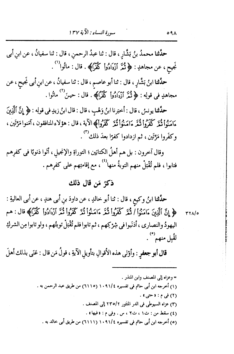 ذِكْرُ مَنْ قَالَ ذَلِكَ: حَدَّثَنَا ابْنُ وَكِيعٍ , قَالَ: ثنا أَبُو خَالِدِ , عَنْ دَاوُدَ بْنِ أَبِي هِنْدٍ , عَنْ أَبِي الْعَالِيَةِ: {§إِنَّ الَّذِينَ آمَنُوا ثُمَّ كَفَرُوا ثُمَّ آمَنُوا ثُمَّ كَفَرُوا ثُمَّ ازْدَادُوا كُفْرًا} [النساء: 137] قَالَ: «هُمُ الْيَهُودُ وَالنَّصَارَى أَذْنَبُوا فِي شِرْكِهِمْ , ثُمَّ تَابُوا فَلَمْ تُقْبَلْ تَوْبَتُهُمْ , وَلَوْ تَابُوا مِنَ الشِّرْكِ لَقُبِلَ مِنْهُمْ» قَالَ أَبُو جَعْفَرٍ: وَأَوْلَى هَذِهِ الْأَقْوَالِ بِتَأْوِيلِ الْآيَةِ قَوْلُ مَنْ قَالَ: عُنِيَ بِذَلِكَ أَهْلُ -[599]- الْكِتَابِ الَّذِينَ أَقَرُّوا بِحُكْمِ التَّوْرَاةِ , ثُمَّ كَذَّبُوا بِخِلَافِهِمْ إِيَّاهُ , ثُمَّ أَقَرَّ مَنْ أَقَرَّ مِنْهُمْ بِعِيسَى وَالْإِنْجِيلِ , ثُمَّ كَذَّبَ بِهِ بِخِلَافِهِ إِيَّاهُ , ثُمَّ كَذَّبَ بِمُحَمَّدٍ صَلَّى اللهُ عَلَيْهِ وَسَلَّمَ وَالْفُرْقَانِ , فَازْدَادَ بِتَكْذِيبِهِ بِهِ كُفْرًا عَلَى كُفْرِهِ وَإِنَّمَا قُلْنَا: ذَلِكَ أَوْلَى بِالصَّوَابِ فِي تَأْوِيلِ هَذِهِ الْآيَةِ , لِأَنَّ الْآيَةَ قَبْلَهَا فِي قَصَصِ أَهْلِ الْكِتَابَيْنِ , أَعْنِي قَوْلَهُ: {يَا أَيُّهَا الَّذِينَ آمَنُوا آمِنُوا بِاللَّهِ وَرَسُولِهِ} [النساء: 136] وَلَا دَلَالَةَ تَدُلُّ عَلَى أَنَّ قَوْلَهُ: {إِنَّ الَّذِينَ آمَنُوا ثُمَّ كَفَرُوا} [النساء: 137] مُنْقَطِعٌ مَعْنَاهُ مِنْ مَعْنَى مَا قَبْلَهُ , فَإِلْحَاقُهُ بِمَا قَبْلَهُ أَوْلَى حَتَّى تَأْتِيَ دَلَالَةٌ دَالَّةٌ عَلَى انْقِطَاعِهِ مِنْهُ. وَأَمَّا قَوْلُهُ: {لَمْ يَكُنِ اللَّهُ لِيَغْفِرَ لَهُمْ} [النساء: 137] فَإِنَّهُ يَعْنِي: لَمْ يَكُنِ اللَّهُ لِيَسْتُرَ عَلَيْهِمْ كُفْرَهُمْ وَذُنُوبَهُمْ بِعَفْوِهِ عَنِ الْعُقُوبَةِ لَهُمْ عَلَيْهِ , وَلَكِنَّهُ يِفْضَحُهُمْ عَلَى رُءُوسِ الْأَشْهَادِ. {وَلَا لِيَهْدِيَهُمْ سَبِيلًا} [النساء: 137] يَقُولُ: " وَلَمْ يَكُنْ لِيُسَدِّدَهُمْ لِإِصَابَةِ طَرِيقِ الْحَقِّ فَيُوَفِّقَهُمْ لَهَا , وَلَكِنَّهُ يَخْذُلُهُمْ عَنْهَا عُقُوبَةً لَهُمْ عَلَى عَظِيمِ جُرْمِهِمْ وَجَرَاءَتِهِمْ عَلَى رَبِّهِمْ. وَقَدْ ذَهَبَ قَوْمٌ إِلَى أَنَّ الْمُرْتَدَّ يُسْتَتَابُ ثَلَاثًا انْتِزَاعًا مِنْهُمْ بِهَذِهِ الْآيَةِ , وَخَالَفَهُمْ عَلَى ذَلِكَ آخَرُونَ