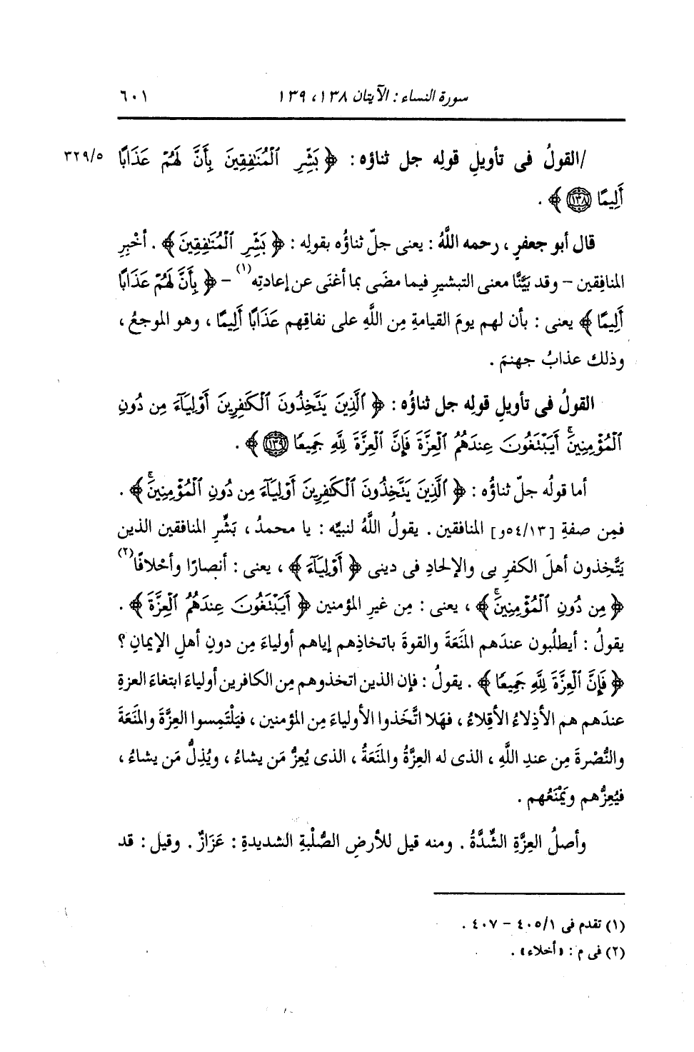 §الْقَوْلُ فِي تَأْوِيلِ قَوْلِهِ تَعَالَى: {الَّذِينَ يَتَّخِذُونَ الْكَافِرِينَ أَوْلِيَاءَ مِنْ دُونَ الْمُؤْمِنِينَ أَيَبْتَغُونَ عِنْدَهُمُ الْعِزَّةَ فَإِنَّ الْعِزَّةَ لِلَّهِ جَمِيعًا} [النساء: 139] أَمَّا قَوْلُهُ جَلَّ ثَنَاؤُهُ: {الَّذِينَ يَتَّخِذُونَ الْكَافِرِينَ أَوْلِيَاءَ مِنْ دُونِ الْمُؤْمِنِينَ} [النساء: 139] فَمِنْ صِفَةِ الْمُنَافِقِينَ. يَقُولُ اللَّهُ لِنَبِيِّهِ: يَا مُحَمَّدُ , بَشِّرِ الْمُنَافِقِينَ الَّذِينَ يَتَّخِذُونَ أَهْلَ الْكُفْرِ بِي وَالْإِلْحَادِ فِي دِينِي أَوْلِيَاءَ: يَعْنِي أَنْصَارًا وَأَخِلَّاءَ مِنْ دُونِ الْمُؤْمِنِينَ , يَعْنِي: مِنْ غَيْرِ الْمُؤْمِنِينَ {أَيَبْتَغُونَ عِنْدَهُمُ الْعِزَّةَ} [النساء: 139] يَقُولُ: " أَيَطْلُبُونَ عِنْدَهُمُ الْمَنْعَةَ وَالْقُوَّةَ بِاتِّخَاذِهِمْ إِيَّاهُمْ أَوْلِيَاءَ مِنْ دُونِ أَهْلِ الْإِيمَانِ بِي {فَإِنَّ الْعِزَّةَ لِلَّهِ جَمِيعًا} [النساء: 139] يَقُولُ: " فَإِنَّ الَّذِينَ اتَّخَذُوهُمْ مِنَ الْكَافِرِينَ أَوْلِيَاءَ ابْتِغَاءَ الْعِزَّةِ عِنْدَهُمْ , هُمُ الْأَذِلَّاءُ الْأَقِلَّاءُ , فَهَلَا اتَّخَذُوا الْأَوْلِيَاءَ مِنَ الْمُؤْمِنِينَ , فَيَلْتَمِسُوا الْعِزَّةَ وَالْمَنَعَةُ وَالنُّصْرَةَ مِنْ عِنْدِ اللَّهِ , الَّذِي لَهُ الْعِزَّةُ وَالْمَنْعَةُ , الَّذِي يُعِزُّ مَنْ يَشَاءٍ , وَيُذِلَّ مَنْ يَشَاءُ فَيُعِزَّهُمْ وَيَمْنَعَهُمْ؟ وَأَصْلُ الْعِزَّةِ: الشِّدَّةُ؛ وَمِنْهُ قِيلَ لِلْأَرْضِ الصَّلْبَةِ الشَّدِيدَةِ: عِزَازٌ , وَقِيلَ: قَدِ
