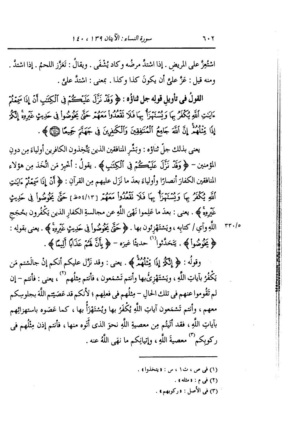 §الْقَوْلُ فِي تَأْوِيلِ قَوْلِهِ تَعَالَى: {وَقَدْ نُزِّلَ عَلَيْكُمْ فِي الْكِتَابِ أَنْ إِذَا سَمِعْتُمْ آيَاتِ اللَّهِ يُكَفِّرُ بِهَا وَيُسْتَهْزَأُ بِهَا فَلَا تَقْعُدُوا مَعَهُمْ حَتَّى يَخُوضُوا فِي حَدِيثٍ غَيْرِهِ إِنَّكُمْ إِذًا مَثَلُهُمْ إِنَّ اللَّهَ جَامِعُ الْمُنَافِقِينَ وَالْكَافِرِينَ فِي جَهَنَّمَ جَمِيعًا} [النساء: 140] يَعْنِي بِذَلِكَ جَلَّ ثَنَاؤُهُ: بَشِّرِ الْمُنَافِقِينَ الَّذِينَ يَتَّخِذُونَ الْكَافِرِينَ أَوْلِيَاءَ مِنْ دُونَ الْمُؤْمِنِينَ. {وَقَدْ نُزِّلَ عَلَيْكُمْ فِي الْكِتَابِ} [النساء: 140] يَقُولُ: " أُخْبِرَ مَنِ اتَّخَذَ مِنْ هَؤُلَاءِ الْمُنَافِقِينَ الْكُفَّارِ أَنْصَارًا وَأَوْلِيَاءَ بَعْدَمَا نَزَلَ عَلَيْهِمْ مِنَ الْقُرْآنِ {أَنْ إِذَا سَمِعْتُمْ آيَاتِ اللَّهِ يُكْفَرُ بِهَا وَيُسْتَهْزَأُ بِهَا فَلَا تَقْعُدُوا مَعَهُمْ حَتَّى يَخُوضُوا فِي حَدِيثٍ غَيْرِهِ} [النساء: 140] يَعْنِي: بَعْدَمَا عَلِمُوا نَهْيَ اللَّهِ عَنْ مُجَالَسَةِ الْكُفَّارِ الَّذِينَ يَكْفُرُونَ بِحُجَجِ اللَّهِ وَآيِ كِتَابِهِ , وَيَسْتَهْزِئُونَ بِهَا {حَتَّى يَخُوضُوا فِي حَدِيثٍ غَيْرِهِ} [النساء: 140] يَعْنِي بِقَوْلِهِ: {يَخُوضُوا} [النساء: 140] يَتَحَدَّثُوا حَدِيثًا غَيْرَهُ بِأَنَّ لَهُمْ عَذَابًا أَلِيمًا. وَقَوْلُهُ: {إِنَّكُمْ إِذًا مِثْلُهُمْ} [النساء: 140] يَعْنِي: وَقَدْ نُزِّلَ عَلَيْكُمْ أَنَّكُمْ إِنْ جَالَسْتُمْ مَنْ يَكْفُرُ بِآيَاتِ اللَّهِ , وَيَسْتَهْزِئُ بِهَا وَأَنْتُمْ تَسْمَعُونَ فَأَنْتُمْ مِثْلُهُ , يَعْنِي: فَأَنْتُمْ إِنْ لَمْ تَقُومُوا عَنْهُمْ فِي تِلْكَ الْحَالِ مَثَلُهُمْ فِي فِعْلِهِمْ , لِأَنَّكُمْ قَدْ عَصَيْتُمُ اللَّهَ بِجُلُوسِكُمْ مَعَهُمْ , وَأَنْتُمْ تَسْمَعُونَ آيَاتِ اللَّهِ يُكْفَرُ بِهَا وَيُسْتَهْزَأُ بِهَا , كَمَا عَصَوْهُ بِاسْتِهْزَائِهِمْ بِآيَاتِ اللَّهِ , فَقَدْ أَتَيْتُمْ مِنْ مَعْصِيَةِ اللَّهِ نَحْوَ الَّذِي أَتَوْهُ مِنْهَا , فَأَنْتُمْ إِذًا مِثْلُهُمْ فِي رُكُوبِكُمْ مَعْصِيَةِ اللَّهِ , وَإِتْيَانِكُمْ مَا نَهَاكُمُ اللَّهُ عَنْهُ.