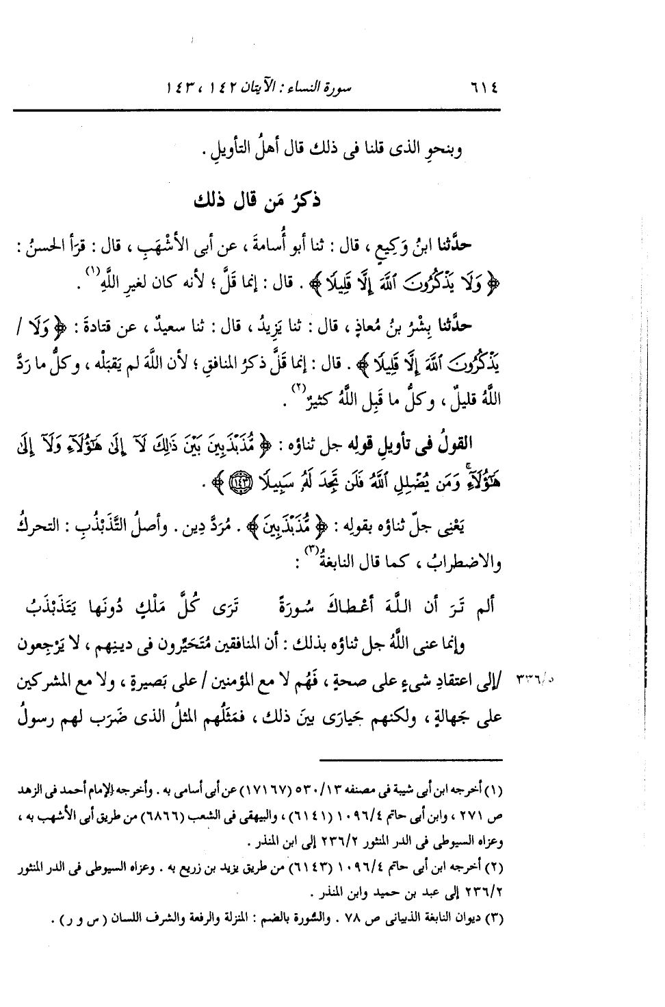 §الْقَوْلُ فِي تَأْوِيلِ قَوْلِهِ تَعَالَى: {مُذَبْذَبِينَ بَيْنَ ذَلِكَ لَا إِلَى هَؤُلَاءِ وَلَا إِلَى هَؤُلَاءِ وَمَنْ يُضْلِلِ اللَّهُ فَلَنْ تَجِدَ لَهُ سَبِيلًا} [النساء: 143] يَعْنِي جَلَّ ثَنَاؤُهُ بِقَوْلِهِ: {مُذَبْذَبِينَ} [النساء: 143] مُرَدَّدِينَ , وَأَصْلُ التَّذَبْذُبِ: التَّحَرُّكُ وَالِاضْطِرَابِ , كَمَا قَالَ النَّابِغَةُ:
