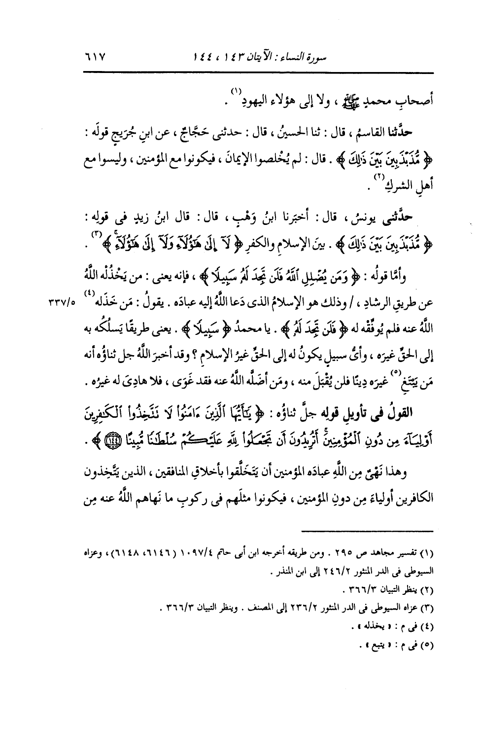 §الْقَوْلُ فِي تَأْوِيلِ قَوْلِهِ تَعَالَى: {يَا أَيُّهَا الَّذِينَ آمَنُوا لَا تَتَّخِذُوا الْكَافِرِينَ أَوْلِيَاءَ مِنْ دُونِ الْمُؤْمِنِينَ أَتُرِيدُونَ أَنْ تَجْعَلُوا لِلَّهِ عَلَيْكُمْ سُلْطَانًا مُبِينًا} [النساء: 144] وَهَذَا نَهْي مِنَ اللَّهِ عِبَادَهُ الْمُؤْمِنِينَ أَنْ يَتَخَلَّقُوا بِأَخْلَاقِ الْمُنَافِقِينَ الَّذِينَ يَتَّخِذُونَ الْكَافِرِينَ أَوْلِيَاءَ مِنْ دُونِ الْمُؤْمِنِينَ , فَيَكُونُوا مِثْلَهُمْ فِي رُكُوبِ مَا نَهَاهُمْ عَنْهُ مِنْ
