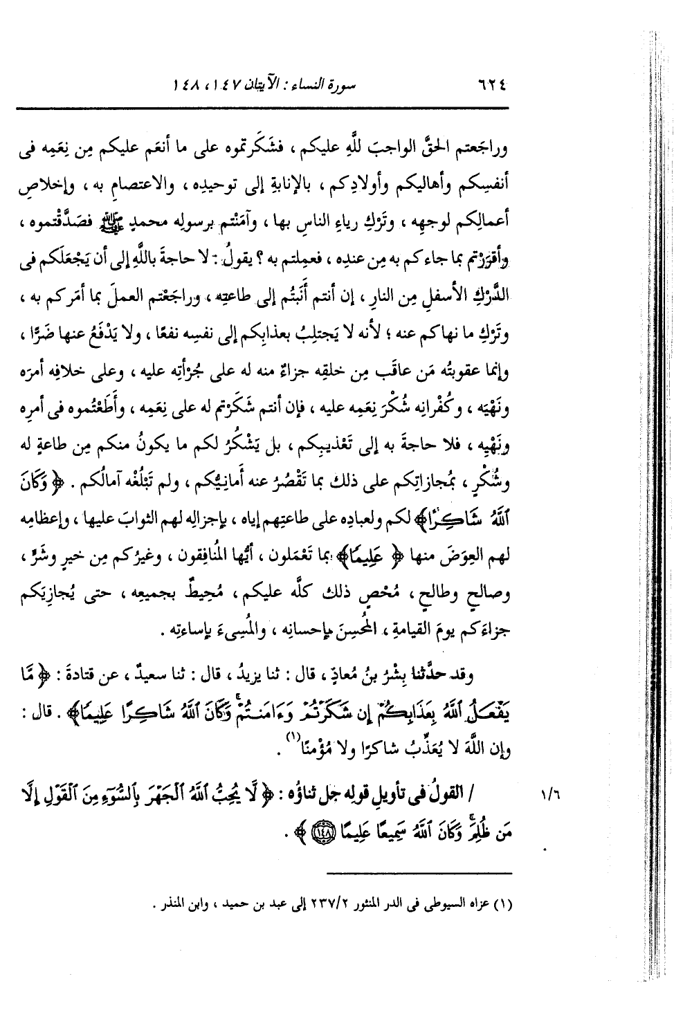 حَدَّثَنَا بِشْرُ بْنُ مُعَاذٍ , قَالَ: ثنا يَزِيدُ , قَالَ: ثنا سَعِيدٌ , عَنْ قَتَادَةَ: {§مَا يَفْعَلُ اللَّهُ بِعَذَابِكُمْ إِنْ شَكَرْتُمْ وَآمَنْتُمْ وَكَانَ اللَّهُ شَاكِرًا عَلِيمًا} [النساء: 147] قَالَ: «إِنَّ اللَّهَ جَلَّ ثَنَاؤُهُ لَا يُعَذَّبُ شَاكِرًا وَلَا مُؤْمِنًا»