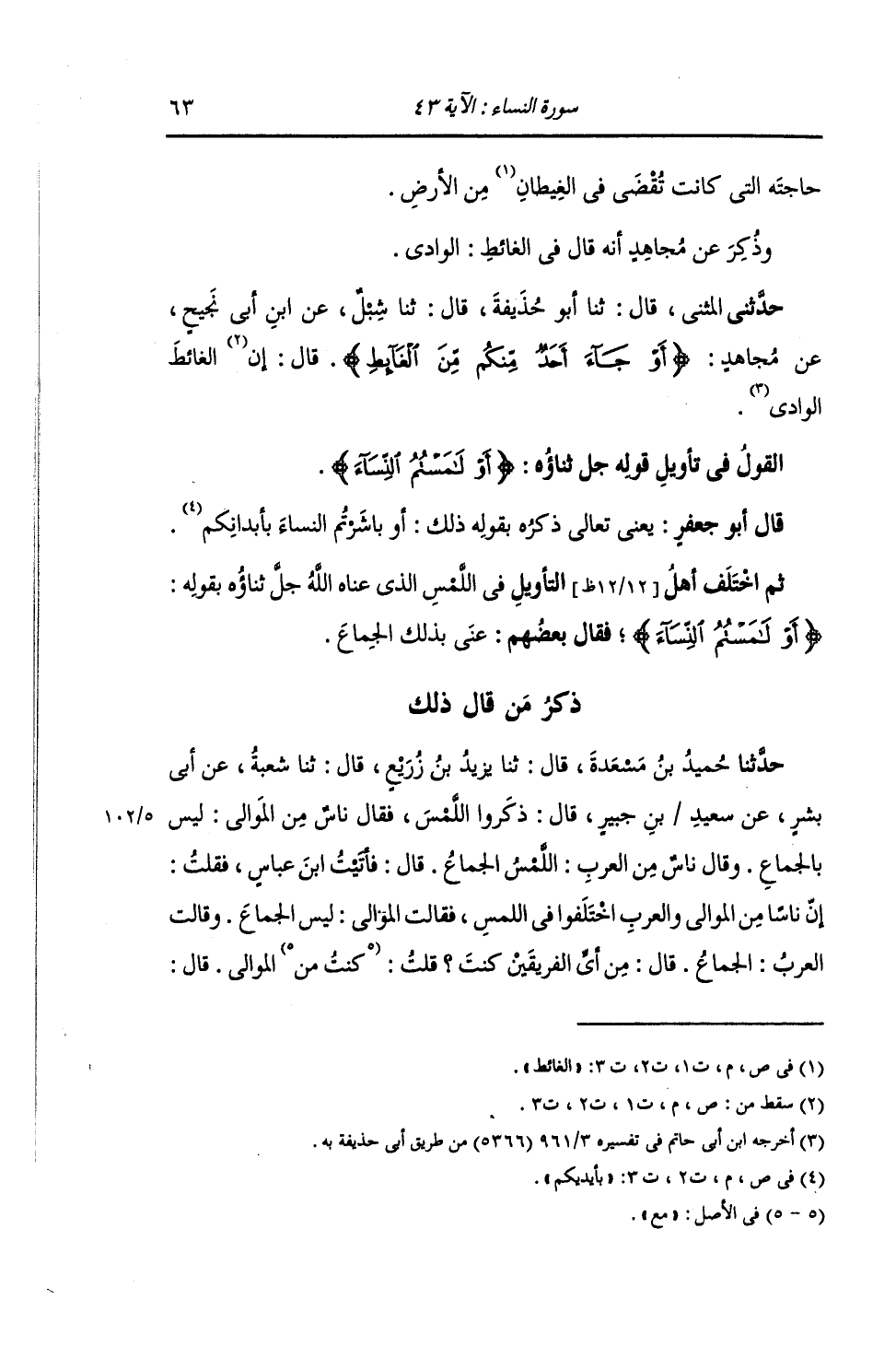 ذِكْرُ مَنْ قَالَ ذَلِكَ: حَدَّثَنَا حُمَيْدُ بْنُ مَسْعَدَةَ , قَالَ: ثنا يَزِيدُ بْنُ زُرَيْعٍ , قَالَ: ثنا شُعْبَةُ , عَنْ أَبِي بِشْرٍ , عَنْ سَعِيدِ بْنِ جُبَيْرٍ , قَالَ: ذَكَرُوا اللَّمْسَ , فَقَالَ نَاسٌ مِنَ الْمَوَالِي: لَيْسَ بِالْجِمَاعِ , وَقَالَ نَاسٌ مِنَ الْعَرَبِ: اللَّمْسُ: الْجِمَاعُ. قَالَ: فَأَتَيْتُ ابْنَ عَبَّاسٍ , فَقُلْتُ: إِنَّ نَاسًا مِنَ الْمَوَالِي وَالْعَرَبِ اخْتَلَفُوا فِي اللَّمْسِ , فَقَالَتِ الْمَوَالِي: لَيْسَ بِالْجِمَاعِ , وَقَالَتِ الْعَرَبُ: الْجِمَاعُ. قَالَ: مِنْ أَيِّ الْفَرِيقَيْنِ كُنْتَ؟ قُلْتُ: كُنْتُ مِنَ الْمَوَالِي قَالَ: -[64]- غُلِبَ فَرِيقُ الْمَوَالِي , §إِنَّ الْمَسَّ وَاللَّمْسَ وَالْمُبَاشَرَةَ: الْجِمَاعُ , وَلَكِنَّ اللَّهَ يُكَنِّي مَا شَاءَ بِمَا شَاءَ " حَدَّثَنَا ابْنُ بَشَّارٍ قَالَ: ثنا مُحَمَّدُ بْنُ جَعْفَرٍ قَالَ: ثنا شُعْبَةُ , عَنْ أَبِي قَيْسٍ , عَنْ سَعِيدِ بْنِ جُبَيْرٍ , عَنِ ابْنِ عَبَّاسٍ , مِثْلَهُ