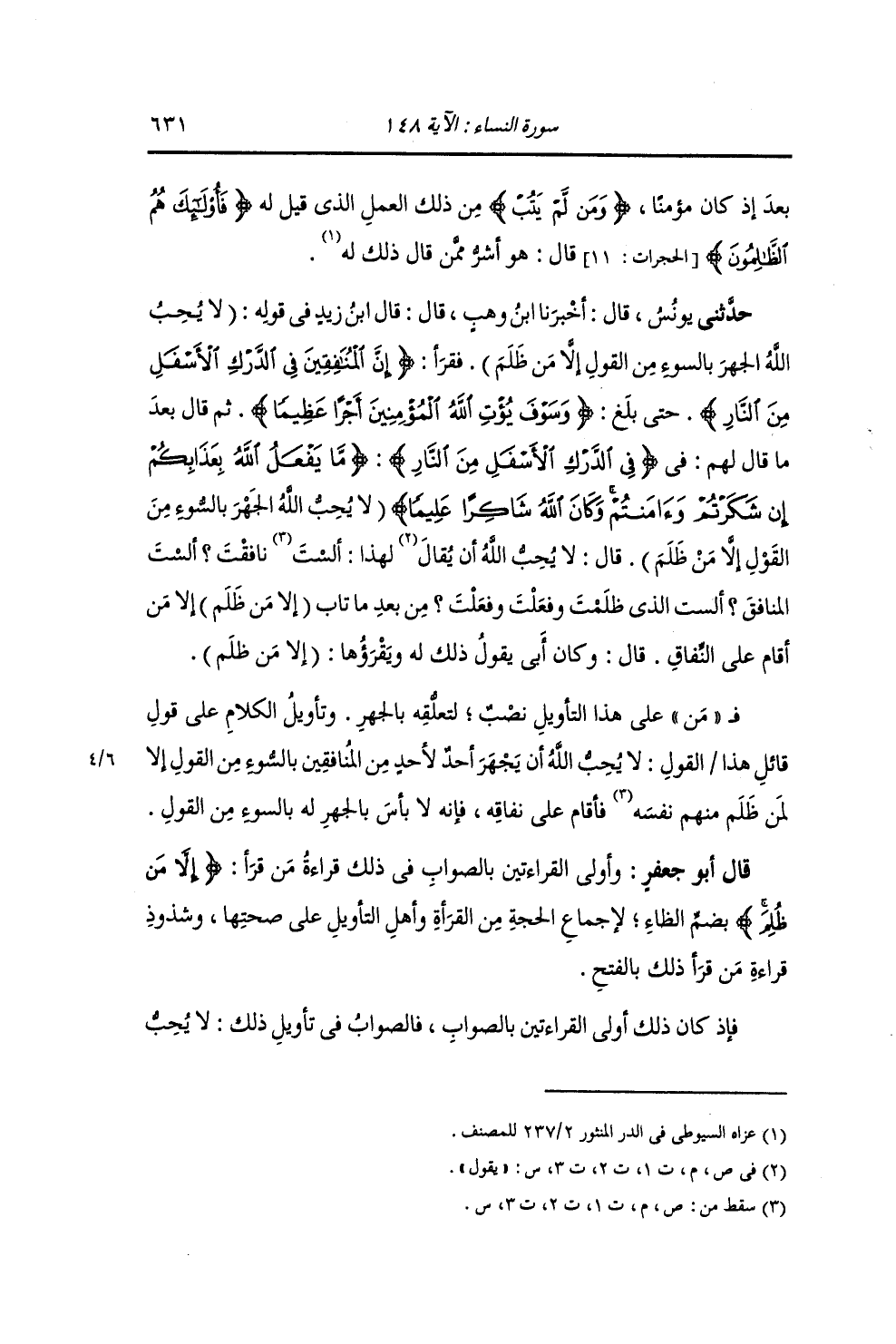 حَدَّثَنِي يُونُسُ , قَالَ: أَخْبَرَنَا ابْنُ وَهْبٍ , قَالَ: قَالَ ابْنُ زَيْدٍ فِي قَوْلِهِ «§لَا يُحِبُّ اللَّهُ الْجَهْرَ بِالسُّوءِ مِنَ الْقَوْلِ إِلَّا مَنْ ظَلَمَ» فَقَرَأَ: {إِنَّ الْمُنَافِقِينَ فِي الدَّرْكِ الْأَسْفَلِ مِنَ النَّارِ} [النساء: 145] حَتَّى بَلَغَ: {وَسَوْفَ يُؤْتِ اللَّهُ الْمُؤْمِنِينَ أَجْرًا عَظِيمًا} [النساء: 146] ثُمَّ قَالَ بَعْدَ مَا قَالَ: هُمْ فِي الدَّرْكِ الْأَسْفَلِ مِنَ النَّارِ {مَا يَفْعَلُ اللَّهُ بِعَذَابِكُمْ إِنْ شَكَرْتُمْ وَآمَنْتُمْ وَكَانَ اللَّهُ شَاكِرًا عَلِيمًا} [النساء: 147] «لَا يُحِبُّ اللَّهُ الْجَهْرَ بِالسُّوءِ مِنَ الْقَوْلِ إِلَّا مَنْ ظَلَمَ» قَالَ: لَا يُحِبُّ اللَّهُ أَنْ يَقُولَ لِهَذَا: أَلَسْتَ نَافَقْتَ؟ أَلَسْتَ الْمُنَافِقَ الَّذِي ظَلَمْتَ وَفَعَلْتَ وَفَعَلْتَ؟ مِنْ بَعْدِ مَا تَابَ «إِلَّا مَنْ ظَلَمَ» إِلَّا مَنْ أَقَامَ عَلَى النِّفَاقِ. قَالَ: وَكَانَ أَبِي يَقُولُ ذَلِكَ لَهُ وَيَقْرَؤُهَا: «إِلَّا مَنْ ظَلَمَ» فَـ «مَنْ» عَلَى هَذَا التَّأْوِيلِ نُصِبَ لِتَعَلُّقِهِ بِالْجَهْرِ. وتَأْوِيلُ الْكَلَامِ عَلَى قَوْلِ قَائِلِ هَذَا الْقَوْلِ: لَا يُحِبُّ اللَّهُ أَنْ يَجْهَرَ أَحَدٌ لِأَحَدٍ مِنَ الْمُنَافِقِينَ بِالسُّوءِ مِنَ الْقَوْلِ «إِلَّا مَنْ ظَلَمَ» مِنْهُمْ , فَأَقَامَ عَلَى نِفَاقِهِ فَإِنَّهُ لَا بَأْسَ بِالْجَهْرِ لَهُ بِالسُّوءِ مِنَ الْقَوْلِ. قَالَ أَبُو جَعْفَرٍ: وَأَوْلَى الْقِرَاءَتَيْنِ بِالصَّوَابِ فِي ذَلِكَ قِرَاءَةُ مَنْ قَرَأَ: {إِلَّا مَنْ ظُلِمَ} [النساء: 148] بِضَمِّ الظَّاءِ , لِإِجْمَاعِ الْحُجَّةِ مِنَ الْقُرَّاءَ وَأَهْلِ التَّأْوِيلِ عَلَى صِحَّتِهَا , وَشُذُوذِ قِرَاءَةِ مَنْ قَرَأَ ذَلِكَ بِالْفَتْحِ , فَإِذْ كَانَ ذَلِكَ أَوْلَى الْقِرَاءَتَيْنِ بِالصَّوَابِ , فَالصَّوَابُ فِي تَأْوِيلِ ذَلِكَ: لَا يُحِبُّ