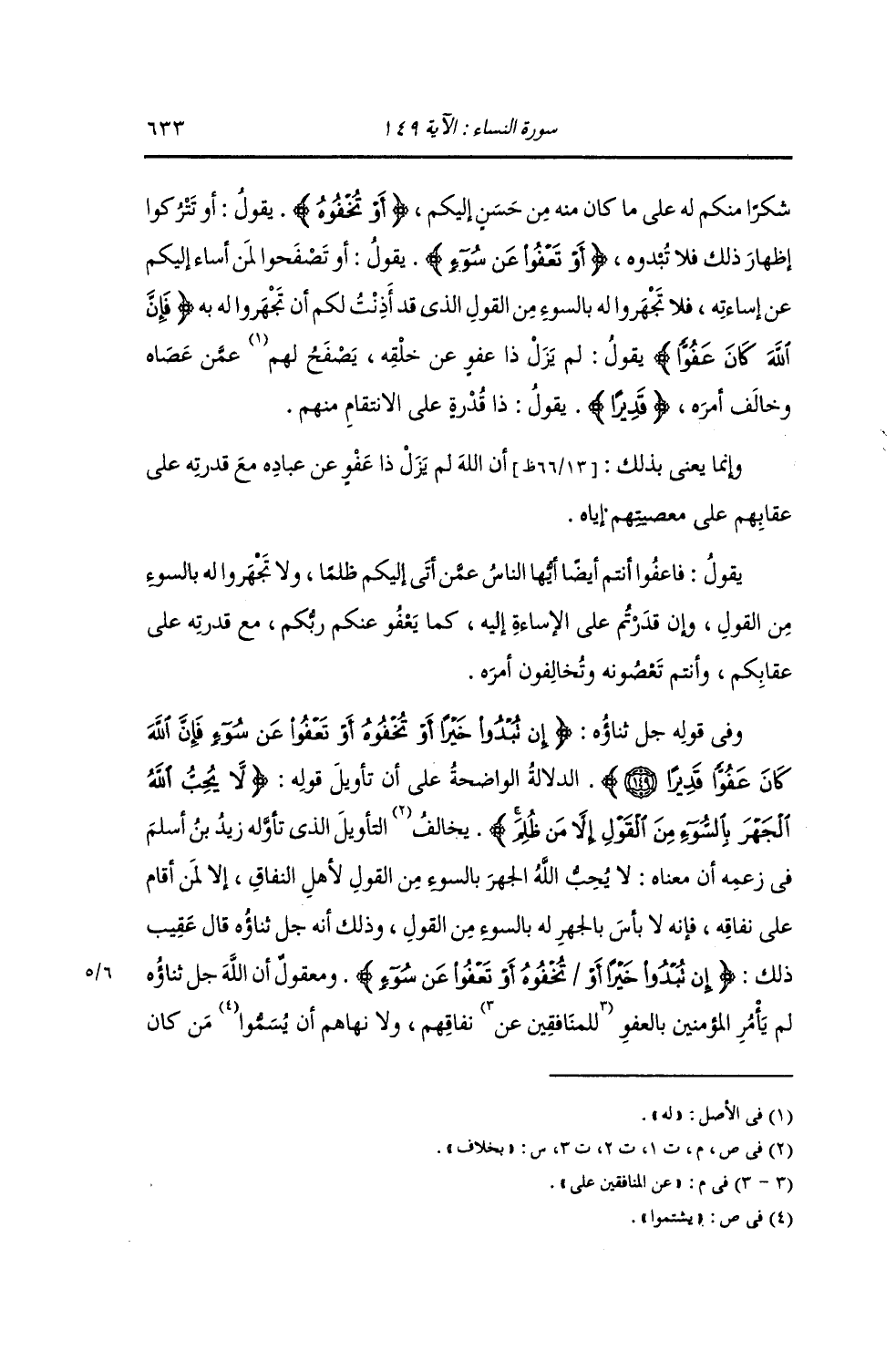 شُكْرًا مِنْكُمْ لَهُ عَلَى مَا كَانَ مِنْهُ مِنْ حُسْنٍ إِلَيْكُمْ , {أَوْ تُخْفُوهُ} [البقرة: 284] يَقُولُ: " أَوْ تَتْرُكُوا إِظْهَارَ ذَلِكَ فَلَا تُبْدُوهُ , {أَوْ تَعْفُوا عَنْ سُوءٍ} [النساء: 149] يَقُولُ: " أَوْ تَصْفَحُوا لِمَنْ أَسَاءَ إِلَيْكُمْ عَنْ إِسَاءَتِهِ , فَلَا تَجْهَرُوا لَهُ بِالسُّوءِ مِنَ الْقَوْلِ الَّذِي قَدْ أَذِنْتُ لَكُمْ أَنْ تَجْهَرُوا لَهُ بِهِ. {فَإِنَّ اللَّهَ كَانَ عَفُوًّا} [النساء: 149] يَقُولُ: " لَمْ يَزَلْ ذَا عَفْو عَنْ خَلْقِهِ , يَصْفَحُ لَهُمْ عَمَّنْ عَصَاهُ وَخَالَفَ أَمْرَهُ. {قَدِيرًا} [النساء: 133] يَقُولُ: " ذَا قُدْرَةٍ عَلَى الِانْتِقَامِ مِنْهُمْ. وَإِنَّمَا يَعْنِي بِذَلِكَ: أَنَّ اللَّهَ لَمْ يَزَلْ ذَا عَفْو مِنْ عِبَادِهِ مَعَ قُدْرَتِهِ عَلَى عِقَابِهِمْ عَلَى مَعْصِيَتِهِمْ إِيَّاهُ. يَقُولُ: فَاعْفُوا أَنْتُمْ أَيْضًا أَيُّهَا النَّاسُ عَمَّنْ أَتَى إِلَيْكُمْ ظُلْمًا , وَلَا تَجْهَرُوا لَهُ بِالسُّوءِ مِنَ الْقَوْلِ وَإِنْ قَدَرْتُمْ عَلَى الْإِسَاءَةِ إِلَيْهِ , كَمَا يَعْفُو عَنْكُمْ رَبُّكُمْ مَعَ قُدْرَتِهِ عَلَى عِقَابِكُمْ وَأَنْتُمْ تَعْصُونَهُ وَتُخَالِفُونَ أَمْرَهُ. وَفِي قَوْلِهِ جَلَّ ثَنَاؤُهُ: {إِنْ تُبْدُوا خَيْرًا أَوْ تُخْفُوهُ أَوْ تَعْفُوا عَنْ سُوءٍ فَإِنَّ اللَّهَ كَانَ عَفُوًّا قَدِيرًا} [النساء: 149] الدَّلَالَةُ الْوَاضِحَةُ عَلَى أَنَّ تَأْوِيلَ قَوْلِهِ: {لَا يُحِبُّ اللَّهُ الْجَهْرَ بِالسُّوءِ مِنَ الْقَوْلِ إِلَّا مَنْ ظُلِمَ} [النساء: 148] بِخِلَافِ التَّأْوِيلِ الَّذِي تَأَوَّلَهُ زَيْدُ بْنُ أَسْلَمَ فِي زَعْمِهِ أَنَّ مَعْنَاهُ: لَا يُحِبُّ اللَّهُ الْجَهْرَ بِالسُّوءِ مِنَ الْقَوْلِ لِأَهْلِ النِّفَاقِ , إِلَّا مَنْ أَقَامَ عَلَى نِفَاقِهِ , فَإِنَّهُ لَا بَأْسُ بِالْجَهْرِ لَهُ بِالسُّوءِ مِنَ الْقَوْلِ. وَذَلِكَ أَنَّهُ جَلَّ ثَنَاؤُهُ قَالَ عُقَيْبَ ذَلِكَ: {إِنْ تُبْدُوا خَيْرًا أَوْ تُخْفُوهُ أَوْ تَعْفُوا عَنْ سُوءٍ} [النساء: 149] وَمَعْقُولٌ أَنَّ اللَّهَ جَلَّ ثَنَاؤُهُ لَمْ يَأْمُرِ الْمُؤْمِنِينَ بِالْعَفْوِ عَنِ الْمُنَافِقِينَ عَلَى نِفَاقِهِمْ , وَلَا نَهَاهُمْ أَنْ يُسَمُّوا مَنْ كَانَ