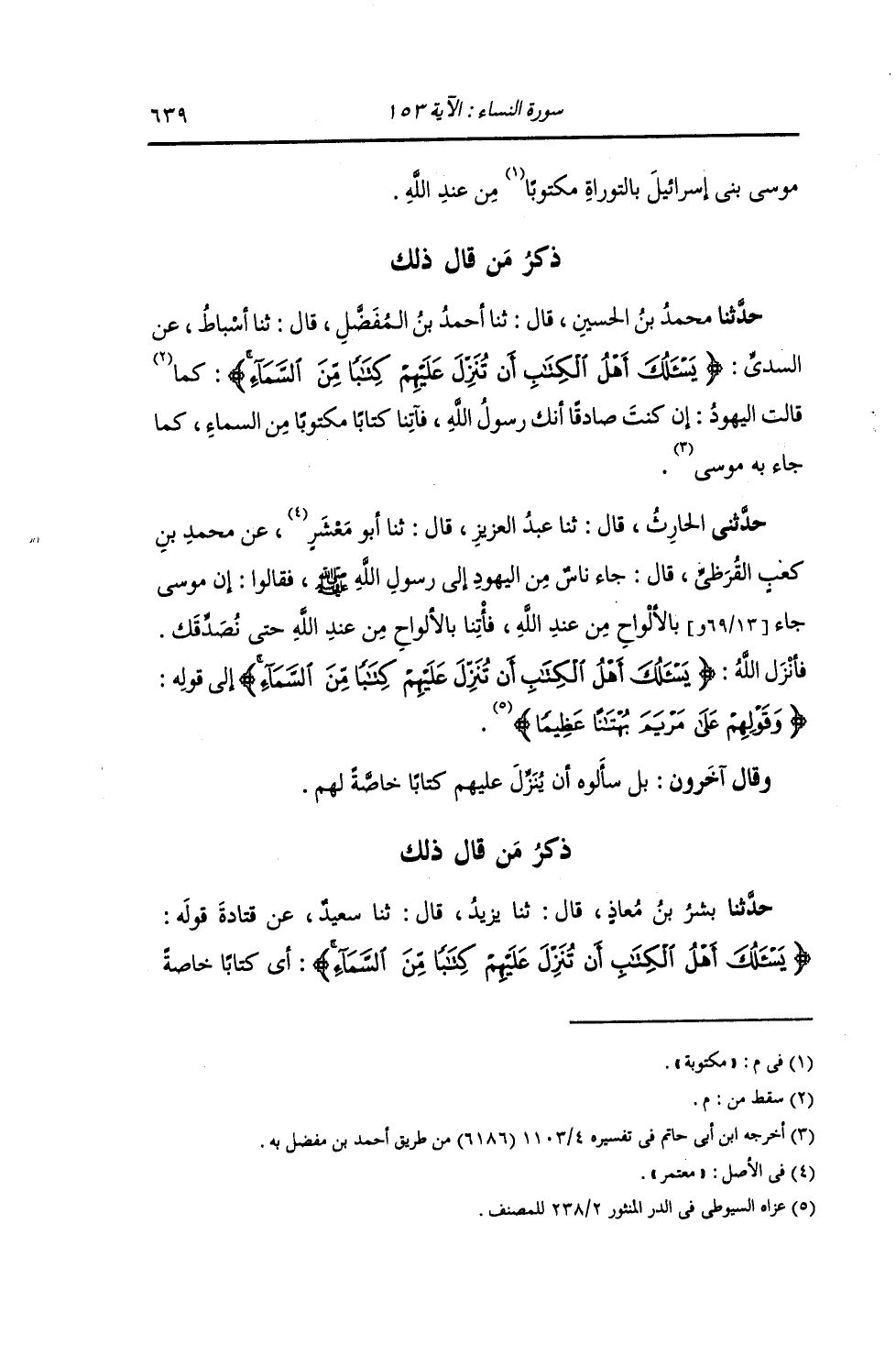 ذِكْرُ مَنْ قَالَ ذَلِكَ: حَدَّثَنَا مُحَمَّدُ بْنُ الْحُسَيْنِ , قَالَ: ثنا أَحْمَدُ بْنُ الْمُفَضَّلِ , قَالَ: ثنا أَسْبَاطٌ , عَنِ السُّدِّيِّ: {§يَسْأَلُكَ أَهْلُ الْكِتَابِ أَنْ تُنَزِّلَ عَلَيْهِمْ كِتَابًا مِنَ السَّمَاءِ} [النساء: 153] قَالَتِ الْيَهُودُ: «إِنْ كُنْتَ صَادِقًا أَنَّكَ رَسُولُ اللَّهِ , فَأْتِنَا كِتَابًا مَكْتُوبًا مِنَ السَّمَاءِ كَمَا جَاءَ بِهِ مُوسَى»