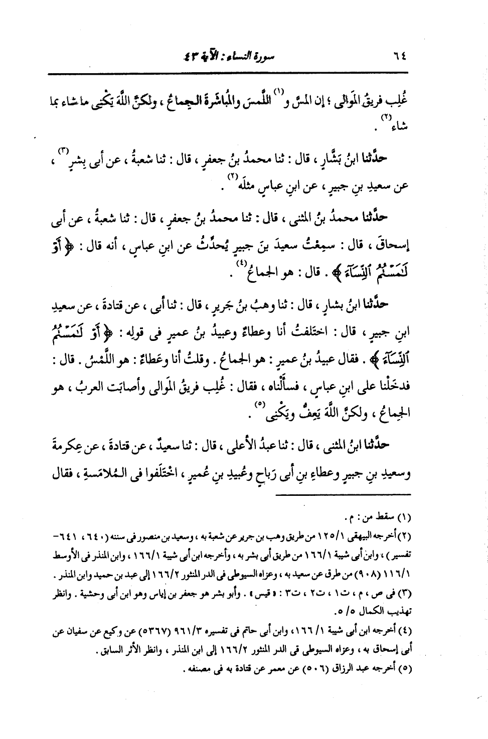 حَدَّثَنَا مُحَمَّدُ بْنُ الْمُثَنَّى , قَالَ: ثنا مُحَمَّدُ بْنُ جَعْفَرٍ , قَالَ: ثنا شُعْبَةُ , عَنْ أَبِي إِسْحَاقَ , قَالَ: سَمِعْتُ سَعِيدَ بْنَ جُبَيْرٍ , يُحَدِّثُ عَنِ ابْنِ عَبَّاسٍ , أَنَّهُ قَالَ: {§أَوْ لَامَسْتُمُ النِّسَاءَ} [النساء: 43] قَالَ: «هُوَ الْجِمَاعُ»