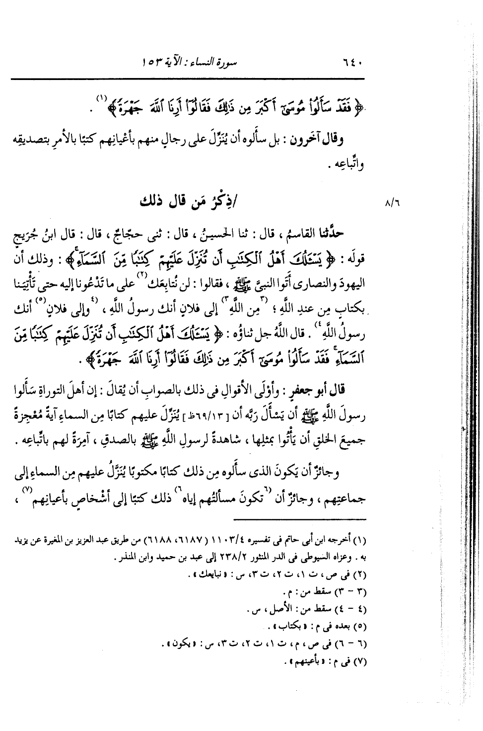 ذِكْرُ مَنْ قَالَ ذَلِكَ: حَدَّثَنَا الْقَاسِمُ , قَالَ: ثنا الْحُسَيْنُ , قَالَ: ثني حَجَّاجٌ , قَالَ: قَالَ ابْنُ جُرَيْجٍ , قَوْلُهُ: {§يَسْأَلُكَ أَهْلُ الْكِتَابِ أَنْ تُنَزِّلَ عَلَيْهِمْ كِتَابًا مِنَ السَّمَاءِ} [النساء: 153] وَذَلِكَ أَنَّ الْيَهُودَ وَالنَّصَارَى أَتَوُا النَّبِيَّ صَلَّى اللهُ عَلَيْهِ وَسَلَّمَ , فَقَالُوا: لَنْ نُتَابِعَكَ عَلَى مَا تَدْعُونَا إِلَيْهِ , حَتَّى تَأْتِيَنَا بِكِتَابٍ مِنْ عِنْدِ اللَّهِ إِلَى فُلَانٍ أَنَّكَ رَسُولُ اللَّهِ , وَإِلَى فُلَانٍ بِكِتَابٍ أَنَّكَ رَسُولُ اللَّهِ. قَالَ اللَّهُ جَلَّ ثَنَاؤُهُ: {يَسْأَلُكَ أَهْلُ الْكِتَابِ أَنْ تُنَزِّلَ عَلَيْهِمْ كِتَابًا مِنَ السَّمَاءِ فَقَدْ سَأَلُوا مُوسَى أَكْبَرَ مِنْ ذَلِكَ فَقَالُوا أَرِنَا اللَّهَ جَهْرَةً} [النساء: 153] " قَالَ أَبُو جَعْفَرٍ: وَأَوْلَى الْأَقْوَالِ فِي ذَلِكَ بِالصَّوَابِ أَنْ يُقَالَ: إِنَّ أَهْلَ التَّوْرَاةِ سَأَلُوا رَسُولَ اللَّهِ صَلَّى اللهُ عَلَيْهِ وَسَلَّمَ أَنْ يَسْأَلَ رَبَّهُ أَنْ يُنَزِّلَ عَلَيْهِمْ كِتَابًا مِنَ السَّمَاءِ آيَةً , مُعْجِزَةً جَمِيعَ الْخَلْقِ عَنْ أَنْ يَأْتُوا بِمِثْلِهَا , شَاهِدَةً لِرَسُولِ اللَّهِ صَلَّى اللهُ عَلَيْهِ وَسَلَّمَ بِالصِّدْقِ , آمِرَةً لَهُمْ بِاتِّبَاعِهِ. وَجَائِزٌ أَنْ يَكُونَ الَّذِي سَأَلُوهُ مِنْ ذَلِكَ كِتَابًا مَكْتُوبًا يَنْزِلُ عَلَيْهِمْ مِنَ السَّمَاءِ إِلَى جَمَاعَتِهِمْ , وَجَائِزٌ أَنْ يَكُونَ ذَلِكَ كُتُبًا إِلَى أَشْخَاصٍ بِأَعْيُنِهِمْ.