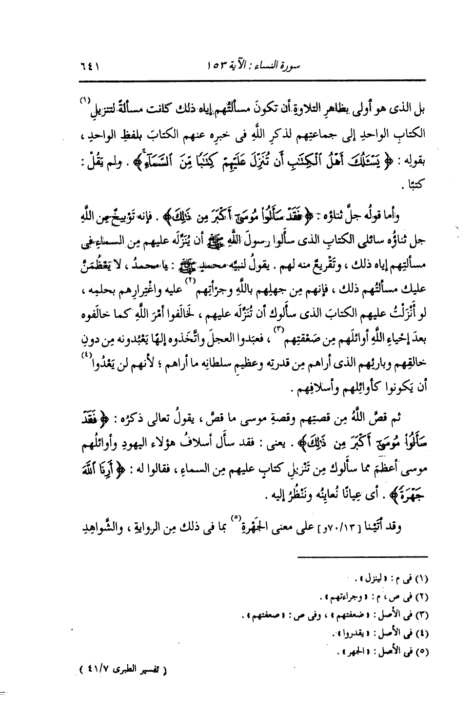 بَلِ الَّذِي هُوَ أَوْلَى بِظَاهِرِ التِّلَاوَةِ أَنْ تَكُونَ مَسْأَلَتُهُمْ إِيَّاهُ ذَلِكَ كَانَتْ مَسْأَلَةً لِيُنَزِّلَ الْكِتَابَ الْوَاحِدَ إِلَى جَمَاعَتِهِمْ لِذِكْرِ اللَّهِ تَعَالَى فِي خَبَرِهِ عَنْهُمُ الْكِتَابَ بِلَفْظِ الْوَاحِدِ , بِقَوْلِهِ: {يَسْأَلُكَ أَهْلُ الْكِتَابِ أَنْ تُنَزِّلَ عَلَيْهِمْ كِتَابًا مِنَ السَّمَاءِ} [النساء: 153] وَلَمْ يَقُلْ: كُتُبًا. وَأَمَّا قَوْلُهُ: {فَقَدْ سَأَلُوا مُوسَى أَكْبَرَ مِنْ ذَلِكَ} [النساء: 153] فَإِنَّهُ تَوْبِيخٌ مِنَ اللَّهِ جَلَّ ثَنَاؤُهُ سَائِلِي الْكِتَابِ الَّذِي سَأَلُوا رَسُولَ اللَّهِ صَلَّى اللهُ عَلَيْهِ وَسَلَّمَ أَنْ يُنَزِّلَهُ عَلَيْهِمْ مِنَ السَّمَاءِ فِي مَسْأَلَتِهِمْ إِيَّاهُ ذَلِكَ , وَتَقْرِيعٌ مِنْهُ لَهُمْ. يَقُولُ لِنَبِيِّهِ صَلَّى اللهُ عَلَيْهِ وَسَلَّمَ: يَا مُحَمَّدُ لَا يَعْظُمَنَّ عَلَيْكَ مَسْأَلَتُهُمْ ذَلِكَ , فَإِنَّهُمْ مِنْ جَهْلِهِمْ بِاللَّهِ وَجَرَاءَتِهِمْ عَلَيْهِ وَاغْتِرَارِهِمْ بِحِلْمِهِ , لَوْ أَنْزَلْتَ عَلَيْهِمُ الْكِتَابَ الَّذِي سَأَلُوكَ أَنْ تُنْزِلَهُ عَلَيْهِمْ , لَخَالَفُوا أَمْرَ اللَّهِ كَمَا خَالَفُوهُ بَعْدَ إِحْيَاءِ اللَّهِ أَوَائِلِهِمْ مِنْ صَعْقَتِهِمْ , فعَبَدُوا الْعِجْلَ , وَاتَّخَذُوهُ إِلَهًا يَعْبُدُونَهُ مِنْ دُونِ خَالِقِهِمْ وَبَارِئِهِمُ الَّذِي أَرَاهُمْ مِنْ قُدْرَتِهِ وَعَظِيَمِ سُلْطَانِهِ مَا أَرَاهُمْ؛ لِأَنَّهُمْ لَنْ يَعْدُوا أَنْ يَكُونُوا كَأَوَائِلِهِمْ وَأَسْلَافِهِمْ. ثُمَّ قَصَّ اللَّهُ مِنْ قِصَّتِهِمْ وَقِصَّةِ مُوسَى مَا قَصَّ , يَقُولُ اللَّهُ: {فَقَدْ سَأَلُوا مُوسَى أَكْبَرَ مِنْ ذَلِكَ} [النساء: 153] يَعْنِي: فَقَدْ سَأَلَ أَسْلَافُ هَؤُلَاءِ الْيَهُودِ وَأَوَائِلُهُمْ مُوسَى عَلَيْهِ السَّلَامُ أَعْظَمَ مِمَّا سَأَلُوكَ مِنْ تَنْزِيلِ كِتَابٍ عَلَيْهِمْ مِنَ السَّمَاءِ فَقَالُوا لَهُ {أَرِنَا اللَّهَ جَهْرَةً} [النساء: 153] أَيْ عِيَانًا نُعَايِنُهُ وَنَنْظُرُ إِلَيْهِ. وَقَدْ أَتَيْنَا عَلَى مَعْنَى الْجَهْرَةِ بِمَا فِي ذَلِكَ مِنَ الرِّوَايَةِ وَالشَّوَاهِدِ