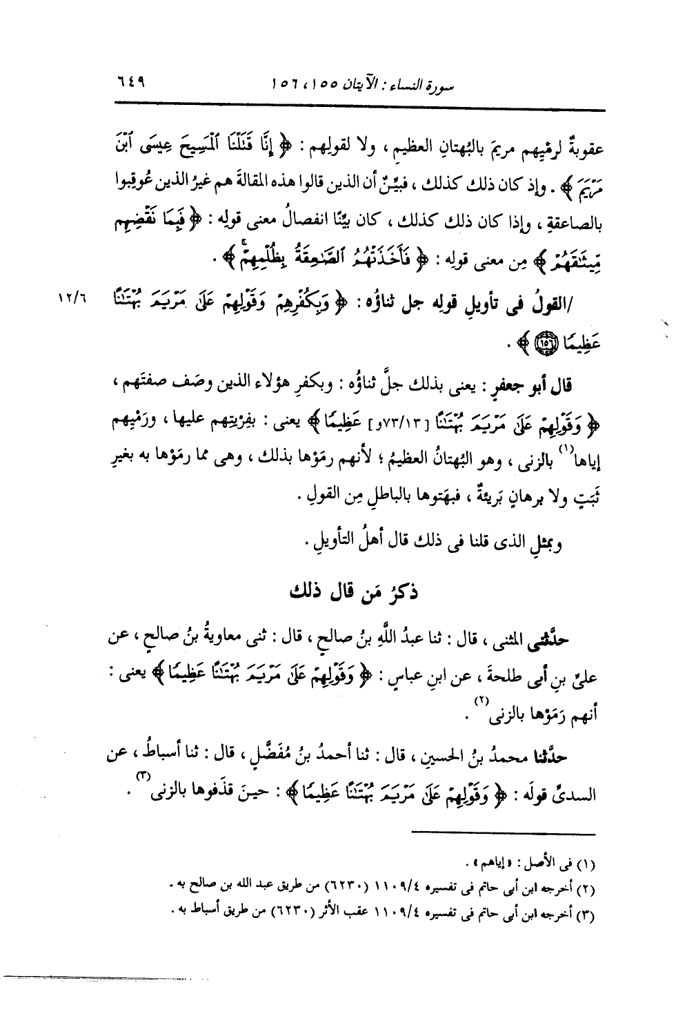 ذِكْرُ مَنْ قَالَ ذَلِكَ: حَدَّثَنِي الْمُثَنَّى , قَالَ: ثنا عَبْدُ اللَّهِ بْنُ صَالِحٍ , قَالَ: ثني مُعَاوِيَةُ بْنُ صَالِحٍ , عَنْ عَلِيِّ بْنِ أَبِي طَلْحَةَ , عَنِ ابْنِ عَبَّاسٍ: {§وَقَوْلِهِمْ عَلَى مَرْيَمَ بُهْتَانًا عَظِيمًا} [النساء: 156] يَعْنِي أَنَّهُمْ رَمَوْهَا بِالزِّنَا "
