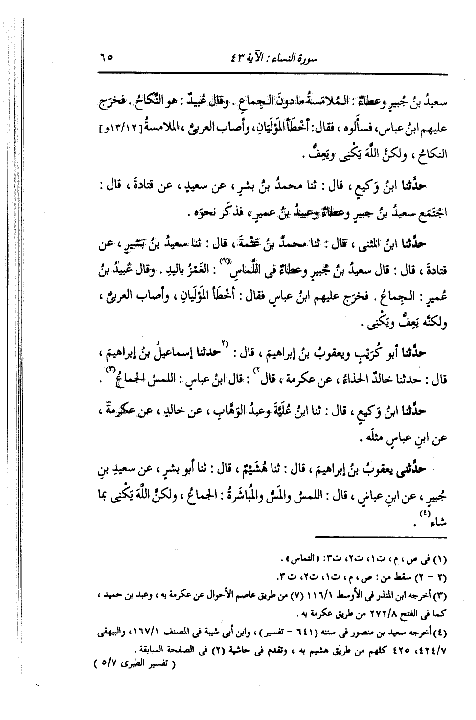 حَدَّثَنِي يَعْقُوبُ بْنُ إِبْرَاهِيمَ قَالَ: ثنا هُشَيْمٌ قَالَ: ثنا أَبُو بِشْرٍ , عَنْ سَعِيدِ بْنِ جُبَيْرٍ , عَنِ ابْنِ عَبَّاسٍ قَالَ: " §اللَّمْسُ وَالْمَسُّ وَالْمُبَاشَرَةُ: الْجِمَاعُ , وَلَكِنَّ اللَّهَ يَكْنِي بِمَا شَاءَ "