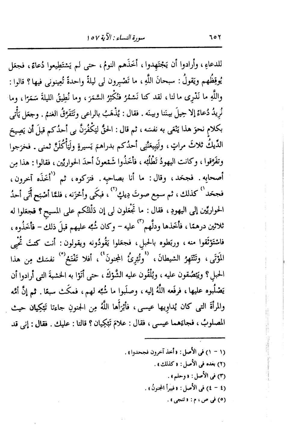 لِلدُّعَاءِ , وَأَرَادُوا أَنْ يَجْتَهِدُوا , أَخَذَهُمُ النَّوْمُ حَتَّى لَمْ يَسْتَطِيعُوا دُعَاءً , فَجَعَلَ يُوقِظُهُمْ وَيَقُولُ: سُبْحَانَ اللَّهِ , أَمَا تَصْبِرُونَ لِي لَيْلَةً وَاحِدَةً تُعِينُونِي فِيهَا؟ قَالُوا: وَاللَّهِ مَا نَدْرِي مَا لَنَا , لَقَدْ كُنَّا نَسْمُرُ فَنُكْثِرُ السَّمَرَ , وَمَا نُطِيقُ اللَّيْلَةَ سَمَرًا وَمَا نُرِيدُ دُعَاءً إِلَّا حِيلَ بَيْنَنَا وَبَيْنَهُ. فَقَالَ: يُذْهَبُ بِالرَّاعِي وَتَتَفَرَّقُ الْغَنَمُ. وجَعَلَ يَأْتِي بِكَلَامٍ نَحْوِ هَذَا يَنْعَى بِهِ نَفْسَهُ , ثُمَّ قَالَ: الْحَقُّ لَيَكْفُرَنَّ بِي أَحَدُكُمْ قَبْلَ أَنْ يَصِيحَ الدِّيكُ ثَلَاثَ مَرَّاتٍ , وَلَيَبِيعَنِي أَحَدُكُمْ بِدَرَاهِمَ يَسِيرَةٍ , وَلَيَأْكُلَنَّ ثَمَنِي , فَخَرَجُوا وَتَفَرَّقُوا , وَكَانَتِ الْيَهُودُ تَطْلُبُهُ , فَأَخَذُوا شَمْعُونَ أَحَدَ الْحَوَارِيِّينَ , فَقَالُوا: هَذَا مِنْ أَصْحَابِهِ , فَجَحَدَ , وَقَالَ: مَا أَنَا بِصَاحِبِهِ , فَتَرَكُوهُ , ثُمَّ أَخَذَهُ آخَرُونَ , فَجَحَدَ كَذَلِكَ , ثُمَّ سَمِعَ صَوْتَ دِيكٍ , فَبَكَى وَأَحْزَنَهُ. فَلَمَّا أَصْبَحَ أَتَى أَحَدُ الْحَوَارِيِّينَ إِلَى الْيَهُودِ , فَقَالَ: مَا تَجْعَلُونَ لِي إِنْ دَلَلْتُكُمْ عَلَى الْمَسِيحِ؟ فَجَعَلُوا لَهُ ثَلَاثِينَ دِرْهَمًا , فَأَخَذَهَا وَدَلَّهُمْ عَلَيْهِ , وَكَانَ شُبِّهَ عَلَيْهِمْ قَبْلَ ذَلِكَ , فَأَخَذُوهُ فَاسْتَوْثَقُوا مِنْهُ وَرَبَطُوهُ بِالْحَبَلِ , فَجَعَلُوا يَقُودُونَهُ وَيَقُولُونَ لَهُ: أَنْتَ كُنْتَ تُحْيِي الْمَوْتَى وَتَنْتِهِرُ الشَّيْطَانَ وَتُبْرِئُ الْمَجْنُونَ؟ أَفَلَا تُنْجِي نَفْسَكَ مِنْ هَذَا الْحَبْلِ؟ وَيَبْصُقُونَ عَلَيْهِ , وَيُلْقُونَ عَلَيْهِ الشَّوْكَ , حَتَّى أَتَوْا بِهِ الْخَشَبَةَ الَّتِي أَرَادُوا أَنْ يَصْلُبُوهُ عَلَيْهَا , فَرَفَعَهُ اللَّهُ إِلَيْهِ , وَصَلَبُوا مَا شُبِّهَ لَهُمْ , فَمَكَثَ سَبْعًا , ثُمَّ إِنَّ أُمَّهُ وَالْمَرْأَةَ الَّتِي كَانَ يُدَاوِيهَا عِيسَى فَأَبْرَأَهَا اللَّهُ مِنَ الْجُنُونِ جَاءَتَا تَبْكِيَانِ حَيْثُ كَانَ الْمَصْلُوبُ , فَجَاءَهُمَا عِيسَى , فَقَالَ: عَلَامَ تَبْكِيَانِ؟ قَالَتَا: عَلَيْكَ. فَقَالَ: إِنِّي قَدْ