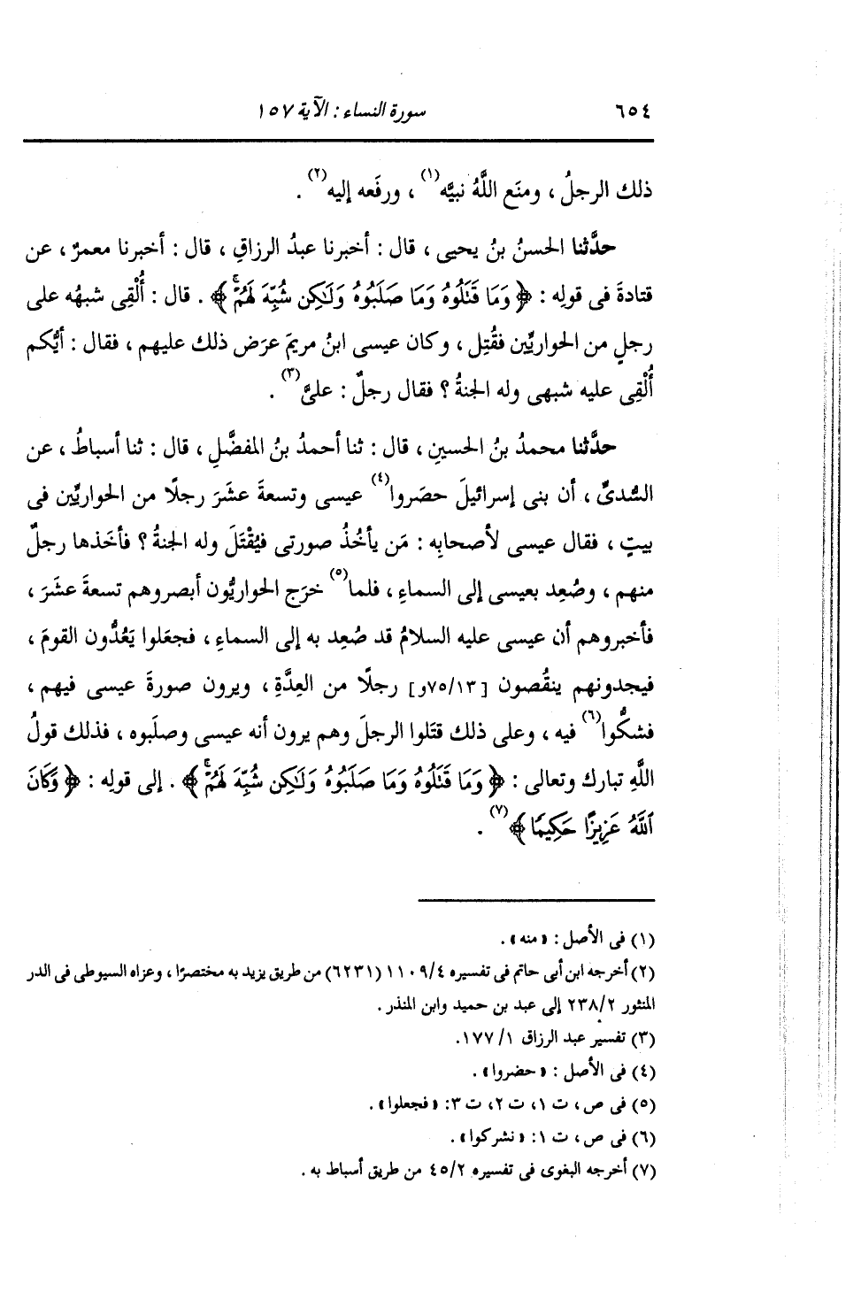 حَدَّثَنَا مُحَمَّدُ بْنُ الْحُسَيْنِ , قَالَ: ثنا أَحْمَدُ بْنُ الْمُفَضَّلِ , قَالَ: ثنا أَسْبَاطٌ , عَنِ السُّدِّيِّ: أَنَّ بَنِي إِسْرَائِيلَ , حَصَرُوا عِيسَى وَتِسْعَةَ عَشَرَ رَجُلًا مِنَ الْحَوَارِيِّينَ فِي بَيْتٍ , فَقَالَ عِيسَى لِأَصْحَابِهِ: مَنْ يَأْخُذْ صُورَتِي فَيُقْتَلْ وَلَهُ الْجَنَّةُ؟ فَأَخَذَهَا رَجُلٌ مِنْهُمْ. §وصُعِدَ بِعِيسَى إِلَى السَّمَاءِ , فَلَمَّا خَرَجَ الْحَوَارِيُّونَ أَبْصَرُوهُمْ تِسْعَةَ عَشَرَ , فَأَخْبَرُوهُمْ أَنَّ عِيسَى عَلَيْهِ السَّلَامُ قَدْ صُعِدَ بِهِ إِلَى السَّمَاءِ , فَجَعَلُوا يَعُدُّونَ الْقَوْمَ فَيَجِدُونَهُمْ يَنْقُصُونَ رَجُلًا مِنَ الْعِدَّةِ , وَيَرَوْنَ صُورَةَ عِيسَى فِيهِمْ , فَشَكُّوا فِيهِ , وَعَلَى ذَلِكَ قَتَلُوا الرَّجُلَ وَهُمْ يَرَوْنَ أَنَّهُ عِيسَى وَصَلَبُوهُ , فَذَلِكَ قَوْلُ اللَّهِ تَبَارَكَ وَتَعَالَى: {وَمَا قَتَلُوهُ وَمَا صَلَبُوهُ وَلَكِنْ شُبِّهَ لَهُمْ} [النساء: 157] إِلَى قَوْلِهِ: {وَكَانَ اللَّهُ عَزِيزًا حَكِيمًا} [النساء: 158] "