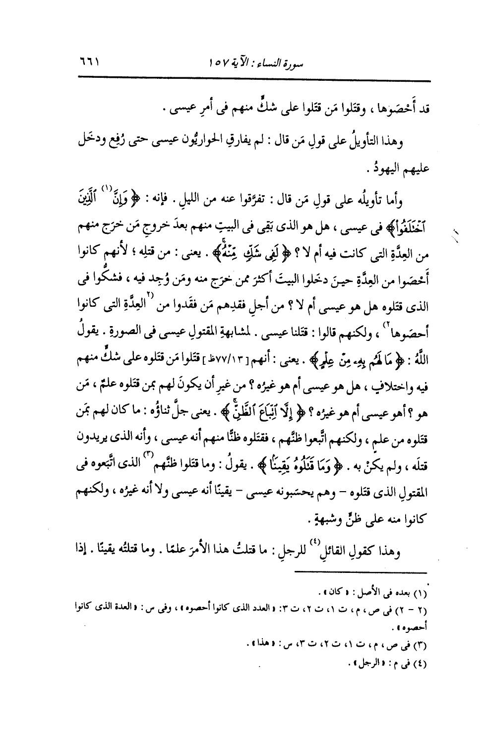 قَدْ أَحْصَوْهَا , وَقَتَلُوا مَنْ قَتَلُوا عَلَى شَكٍّ مِنْهُمْ فِي أَمْرِ عِيسَى. وَهَذَا التَّأْوِيلُ عَلَى قَوْلِ مَنْ قَالَ: لَمْ يُفَارِقِ الْحَوَارِيُّونَ عِيسَى حَتَّى رُفِعَ وَدَخَلَ عَلَيْهِمُ الْيَهُودُ. وَأَمَّا تَأْوِيلُهُ عَلَى قَوْلِ مَنْ قَالَ: تَفَرَّقُوا عَنْهُ مِنَ اللَّيْلِ , فَإِنَّهُ: وَإِنَّ الَّذِينَ اخْتَلَفُوا فِي عِيسَى , هَلْ هُوَ الَّذِي بَقِيَ فِي الْبَيْتِ مِنْهُمْ بَعْدَ خُرُوجِ مَنْ خَرَجَ مِنْهُمْ مِنَ الْعِدَّةِ الَّتِي كَانَتْ فِيهِ أَمْ لَا؟ لَفِي شَكٍّ مِنْهُ , يَعْنِي: مِنْ قَتْلِهِ , لِأَنَّهُمْ كَانُوا أَحْصَوْا مِنَ الْعِدَّةِ حِينَ دَخَلُوا الْبَيْتَ أَكْثَرَ مِمَّنْ خَرَجَ مِنْهُ وَمَنْ وُجِدَ فِيهِ , فَشَكُّوا فِي الَّذِي قَتَلُوهُ هَلْ هُوَ عِيسَى أَمْ لَا مِنْ أَجْلِ فَقْدِهِمْ مَنْ فَقَدُوا مِنَ الْعَدَدِ الَّذِي كَانُوا أَحْصَوْهُ , وَلَكِنَّهُمْ قَالُوا: قَتَلْنَا عِيسَى لِمُشَابَهِةِ الْمَقْتُولِ عِيسَى فِي الصُّورَةِ. يَقُولُ اللَّهُ جَلَّ ثَنَاؤُهُ: {مَا لَهُمْ بِهِ مِنْ عَلِمَ} [النساء: 157] يَعْنِي: أَنَّهُمْ قَتَلُوا مَنْ قَتَلُوهُ عَلَى شَكٍّ مِنْهُمْ فِيهِ وَاخْتِلَافٍ , هَلْ هُوَ عِيسَى أَمْ غَيْرُهُ؟ مِنْ غَيْرِ أَنْ يَكُونَ لَهُمْ بِمَنْ قَتَلُوهُ عِلْمٌ مَنْ هُوَ , هُوَ عِيسَى أَمْ هُوَ غَيْرُهُ؟ {إِلَّا اتِّبَاعَ الظَّنِّ} [النساء: 157] يَعْنِي جَلَّ ثَنَاؤُهُ: مَا كَانَ لَهُمْ بِمَنْ قَتَلُوهُ مِنْ عِلْمٍ , وَلَكِنَّهُمُ اتَّبَعُوا ظَنَّهُمْ , فَقَتَلُوهُ ظَنًّا مِنْهُمْ أَنَّهُ عِيسَى وَأَنَّهُ الَّذِي يُرِيدُونَ قَتْلَهُ , وَلَمْ يَكُنْ بِهِ {وَمَا قَتَلُوهُ يَقِينًا} [النساء: 157] يَقُولُ: " وَمَا قَتَلُوا هَذَا الَّذِي اتَّبَعُوهُ فِي الْمَقْتُولِ الَّذِي قَتَلُوهُ وَهُمْ يَحْسَبُونَهُ عِيسَى يَقِينًا أَنَّهُ عِيسَى , وَلَا أَنَّهُ غَيْرُهُ , وَلَكِنَّهُمْ كَانُوا مِنْهُ عَلَى ظَنٍّ وَشُبْهَةٍ؛ وَهَذَا كَقَوْلِ الرَّجُلِ لِلرَّجُلِ: مَا قَتَلْتَ هَذَا الْأَمْرَ عِلْمًا وَمَا قَتَلْتَهُ يَقِينًا , إِذَا