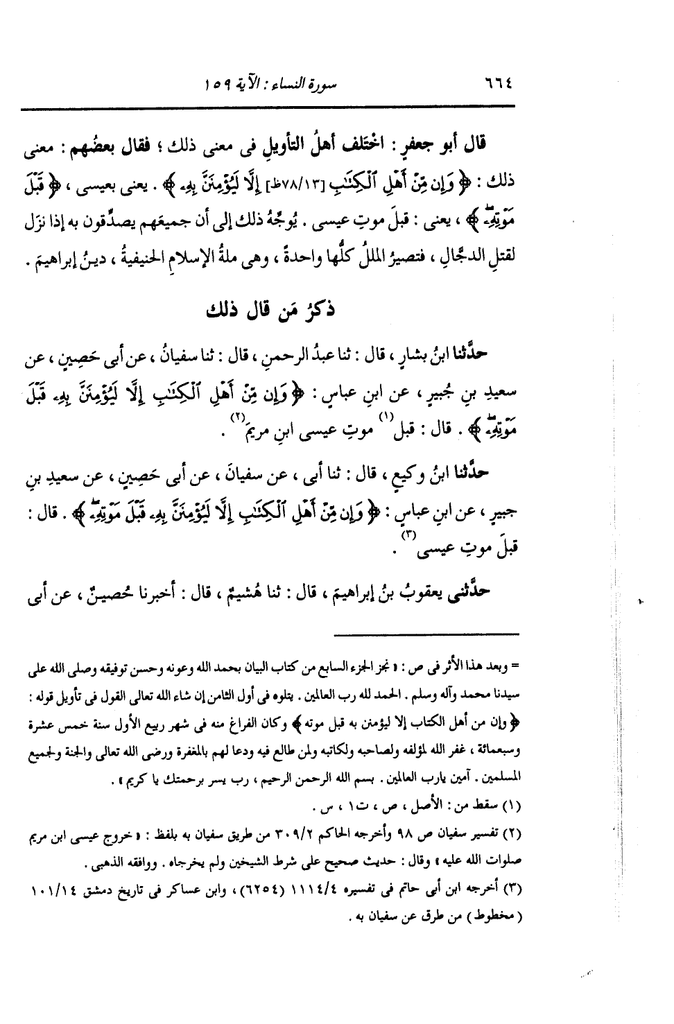 حَدَّثَنَا ابْنُ وَكِيعٍ , قَالَ: ثنا أَبِي , عَنْ سُفْيَانَ , عَنْ أَبِي حُصَيْنٍ , عَنْ سَعِيدِ بْنِ جُبَيْرٍ , عَنِ ابْنِ عَبَّاسٍ: {§وَإِنْ مِنْ أَهْلِ الْكِتَابِ إِلَّا لَيُؤْمِنَنَّ بِهِ قَبْلَ مَوْتِهِ} [النساء: 159] قَالَ: «قَبْلَ مَوْتِ عِيسَى»
