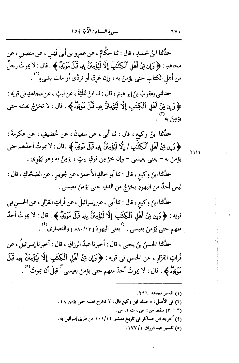 حَدَّثَنَا الْحَسَنُ بْنُ يَحْيَى , قَالَ: أَخْبَرَنَا عَبْدُ الرَّزَّاقِ , قَالَ: أَخْبَرَنَا إِسْرَائِيلُ , عَنْ فُرَاتٍ , عَنِ الْحَسَنِ فِي قَوْلِهِ: {§وَإِنْ مِنْ أَهْلِ الْكِتَابِ إِلَّا لَيُؤْمِنَنَّ بِهِ قَبْلَ مَوْتِهِ} [النساء: 159] قَالَ: «لَا يَمُوتُ أَحَدٌ مِنْهُمْ , حَتَّى يُؤْمِنَ بِعِيسَى قَبْلَ أَنْ يَمُوتَ»