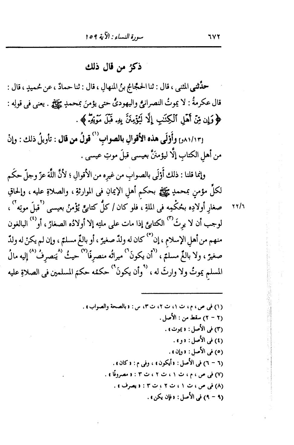 ذِكْرُ مَنْ قَالَ ذَلِكَ: حَدَّثَنِي الْمُثَنَّى , قَالَ: ثنا الْحَجَّاجُ بْنُ الْمِنْهَالِ , قَالَ: ثنا حَمَّادٌ , عَنْ حُمَيْدٍ , قَالَ: قَالَ عِكْرِمَةُ: " لَا يَمُوتُ النَّصْرَانِيُّ وَالْيَهُودِيُّ حَتَّى يُؤْمِنَ بِمُحَمَّدٍ صَلَّى اللهُ عَلَيْهِ وَسَلَّمَ , يَعْنِي فِي قَوْلِهِ: {§وَإِنْ مِنْ أَهْلِ الْكِتَابِ إِلَّا لَيُؤْمِنَنَّ بِهِ قَبْلَ مَوْتِهِ} [النساء: 159] قَالَ أَبُو جَعْفَرٍ: وَأَوْلَى الْأَقْوَالِ بِالصِّحَّةِ وَالصَّوَابِ قَوْلُ مَنْ قَالَ: تَأْوِيلُ ذَلِكَ: وَإِنْ مِنْ أَهْلِ الْكِتَابِ إِلَّا لَيُؤْمِنَنَّ بِعِيسَى قَبْلَ مَوْتِ عِيسَى. وَإِنَّمَا قُلْنَا ذَلِكَ أَوْلَى بِالصَّوَابِ مِنْ غَيْرِهِ مِنَ الْأَقْوَالِ , لِأَنَّ اللَّهَ جَلَّ ثَنَاؤُهُ حَكَمَ لِكُلِّ مُؤْمِنٍ بِمُحَمَّدٍ صَلَّى اللهُ عَلَيْهِ وَسَلَّمَ بِحُكْمِ أَهْلِ الْإِيمَانِ فِي الْمُوَارَثَةِ وَالصَّلَاةِ عَلَيْهِ وَإِلْحَاقِ صِغَارِ أَوْلَادِهِ بِحُكْمِهِ فِي الْمِلَّةِ , فَلَوْ كَانَ كُلُّ كِتَابِيٍّ يُؤْمِنُ بِعِيسَى قَبْلَ مَوْتِهِ , لَوَجَبَ أَنْ لَا يَرِثَ الْكِتَابِيُّ إِذَا مَاتَ عَلَى مِلَّتِهِ إِلَّا أَوْلَادُهُ الصِّغَارُ أَوِ الْبَالِغُونَ مِنْهُمْ مِنْ أَهْلِ الْإِسْلَامِ , إِنْ كَانَ لَهُ وَلَدٌ صَغِيرٌ أَوْ بَالِغٌ مُسْلِمٌ , وَإِنْ لَمْ يَكُنْ لَهُ وَلَدٌ صَغِيرٌ وَلَا بَالِغٌ مُسْلِمٌ , كَانَ مِيرَاثُهُ مَصْرُوفًا حَيْثُ يُصْرَفُ مَالُ الْمُسْلِمِ , يَمُوتُ وَلَا وَارِثَ لَهُ , وَأَنْ يَكُونَ حُكْمُهُ حُكْمَ الْمُسْلِمِينَ فِي الصَّلَاةِ عَلَيْهِ -[673]- وَغُسْلِهِ وَتَقْبِيرِهِ , لِأَنَّ مَنْ مَاتَ مُؤْمِنًا بِعِيسَى فَقَدْ مَاتَ مُؤْمِنًا بِمُحَمَّدٍ وَبِجَمِيعِ الرُّسُلِ؛ وَذَلِكَ أَنَّ عِيسَى صَلَوَاتُ اللَّهِ عَلَيْهِ جَاءَ بِتَصْدِيقِ مُحَمَّدٍ وَجَمِيعِ الْمُرْسَلِينَ , فَالْمُصَدِّقُ بِعِيسَى وَالْمُؤْمِنُ بِهِ مُصَدِّقٌ بِمُحَمَّدٍ وَبِجَمِيعِ أَنْبِيَاءِ اللَّهِ وَرُسُلِهِ , كَمَا أَنَّ الْمُؤْمِنَ بِمُحَمَّدٍ مُؤْمِنٌ بِعِيسَى وَبِجَمِيعِ أَنْبِيَاءِ اللَّهِ وَرُسُلِهِ , فَغَيْرُ جَائِزٍ أَنْ يَكُونَ مُؤْمِنًا بِعِيسَى مَنْ كَانَ بِمُحَمَّدٍ مُكَذِّبًا. فَإِنْ ظَنَّ ظَانٌّ أَنَّ مَعْنَى إِيمَانِ الْيَهُودِيِّ بِعِيسَى , الَّذِي ذَكَرَهُ اللَّهُ فِي قَوْلِهِ: {وَإِنْ مِنْ أَهْلِ الْكِتَابِ إِلَّا لَيُؤْمِنَنَّ بِهِ قَبْلَ مَوْتِهِ} [النساء: 159] إِنَّمَا هُوَ إِقْرَارُهُ بِأَنَّهُ لِلَّهِ نَبِيُّ مَبْعُوثٌ دُونَ تَصْدِيقِهِ بِجَمِيعِ مَا أَتَى بِهِ مِنْ عِنْدِ اللَّهِ , فَقَدْ ظَنَّ خَطَأً. وَذَلِكَ أَنَّهُ غَيْرُ جَائِزٍ أَنْ يَكُونَ مَنْسُوبًا إِلَى الْإِقْرَارِ بِنُبُوَّةِ نَبِيٍّ مَنْ كَانَ لَهُ مُكَذِّبًا فِي بَعْضِ مَا جَاءَ بِهِ مِنْ وَحْيِ اللَّهِ وَتَنْزِيلِهِ , بَلْ غَيْرُ جَائِزٍ أَنْ يَكُونَ مَنْسُوبًا إِلَّا الْإِقْرَارِ بِنُبُوَّةِ أَحَدٍ مِنْ أَنْبِيَاءِ اللَّهِ لِأَنَّ الْأَنْبِيَاءَ جَاءَتِ الْأُمَمَ بِتَصْدِيقِ جَمِيعِ أَنْبِيَاءِ اللَّهِ وَرُسُلِهِ؛ فَالْمُكَذِّبُ بَعْضَ أَنْبِيَاءِ اللَّهِ فِيمَا أَتَى بِهِ أُمَّتَهُ مِنْ عِنْدِ اللَّهِ مُكَذِّبٌ جَمِيعَ أَنْبِيَاءِ اللَّهِ فِيمَا دَعَوْا إِلَيْهِ مِنْ دِينِ عِبَادِ اللَّهِ. وَإِذْ كَانَ ذَلِكَ كَذَلِكَ , كَانَ فِي إِجْمَاعِ الْجَمِيعِ مِنْ أَهْلِ الْإِسْلَامِ عَلَى أَنَّ كُلَّ كِتَابِيٍّ مَاتَ قَبْلَ إِقْرَارِهِ بِمُحَمَّدٍ صَلَوَاتُ اللَّهُ عَلَيْهِ وَمَا جَاءَ بِهِ مِنْ عِنْدِ اللَّهِ , مَحْكُومٌ لَهُ بِحُكْمِ الْمَسْأَلَةِ الَّتِي كَانَ عَلَيْهَا أَيَّامَ حَيَاتِهِ , غَيْرُ مَنْقُولٍ شَيْءٌ -[674]- مِنْ أَحْكَامِهِ فِي نَفْسِهِ وَمَالِهِ وَوَلَدِهِ صِغَارِهِمْ وَكِبَارِهِمْ بِمَوْتِهِ ع