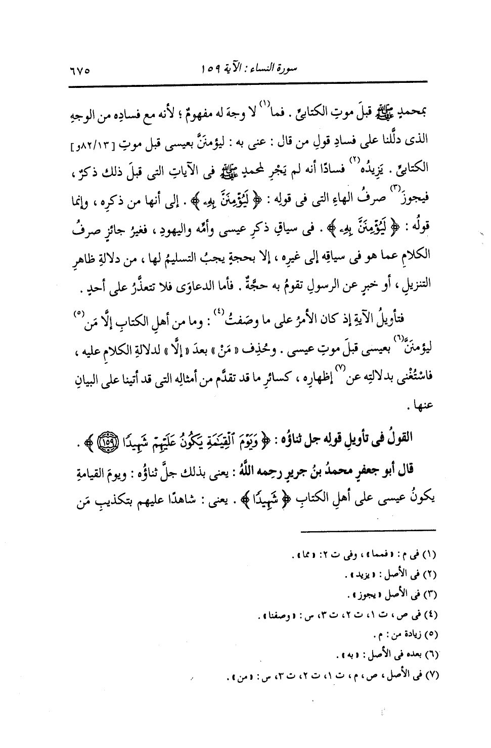 §الْقَوْلُ فِي تَأْوِيلِ قَوْلِهِ تَعَالَى: {وَيَوْمَ الْقِيَامَةِ يَكُونُ عَلَيْهِمْ شَهِيدًا} [النساء: 159] يَعْنِي بِذَلِكَ جَلَّ ثَنَاؤُهُ: {وَيَوْمَ الْقِيَامَةِ يَكُونُ} [النساء: 159] عِيسَى عَلَى أَهْلِ الْكِتَابِ {شَهِيدًا} [البقرة: 143] يَعْنِي: شَاهِدًا عَلَيْهِمْ بِتَكْذِيبِ مَنْ -[676]- كَذَّبَهُ مِنْهُمْ , وَتَصْدِيقِ مَنْ صَدَّقَهُ مِنْهُمْ فِيمَا أَتَاهُمْ بِهِ مِنْ عِنْدِ اللَّهِ وَبِإِبْلَاغِهِ رِسَالَةَ رَبِّهِ. كالَّذِي: