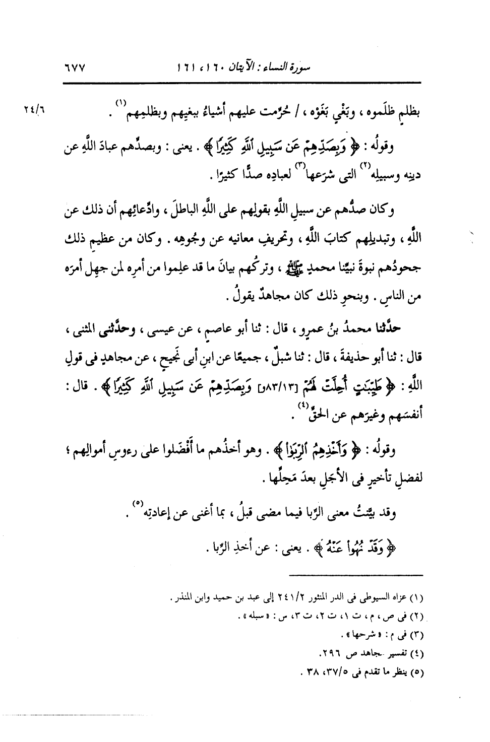 حَدَّثَنَا مُحَمَّدُ بْنُ عَمْرٍو , قَالَ: ثني أَبُو عَاصِمٍ , قَالَ: ثني عِيسَى , عَنِ ابْنِ أَبِي نَجِيحٍ , عَنْ مُجَاهِدٍ , فِي قَوْلِ اللَّهِ: {§وَبِصَدِّهِمْ عَنْ سَبِيلِ اللَّهِ , كَثِيرًا} [النساء: 160] قَالَ: «أَنْفُسَهُمْ وَغَيْرَهُمْ عَنِ الْحَقِّ» حَدَّثَنِي الْمُثَنَّى , قَالَ: ثنا أَبُو حُذَيْفَةَ , قَالَ: ثنا شِبْلٌ , عَنِ ابْنِ أَبِي نَجِيحٍ , عَنْ مُجَاهِدٍ مِثْلَهُ. وَقَوْلِهِ: {وَأَخْذِهِمُ الرِّبَا} [النساء: 161] وَهُوَ أَخْذُهُمْ مَا أَفْضَلُوا عَلَى رُءُوسِ أَمْوَالِهِمْ لِفَضْلِ تَأْخِيرٍ فِي الْأَجَلِ بَعْدَ مَحِلِّهَا. وَقَدْ بَيَّنْتُ مَعْنَى الرِّبَا فِيمَا مَضَى قَبْلُ بِمَا أَغْنَى عَنْ إِعَادَتِهِ {وَقَدْ نُهُوا عَنْهُ} [النساء: 161] يَعْنِي عَنْ أَخْذِ الرِّبَا. -[678]- وَقَوْلُهُ: {وَأَكْلِهِمْ أَمْوَالَ النَّاسِ بِالْبَاطِلِ} [النساء: 161] يَعْنِي: مَا كَانُوا يَأْخُذُونَ مِنَ الرُّشَا عَلَى الْحُكْمِ , كَمَا وَصَفَهُمُ اللَّهُ بِهِ فِي قَوْلِهِ: {وَتَرَى كَثِيرًا مِنْهُمْ يُسَارِعُونَ فِي الْإِثْمِ وَالْعُدْوَانِ وَأَكْلِهِمُ السُّحْتَ لَبِئْسَ مَا كَانُوا يَعْمَلُونَ} [المائدة: 62] وَكَانَ مِنْ أَكْلِهِمْ أَمْوَالِ النَّاسِ بِالْبَاطِلِ مَا كَانُوا يَأْخُذُونَ مِنْ أَثْمَانِ الْكُتُبِ الَّتِي كَانُوا يَكْتُبُونَهَا بِأَيْدِيهِمْ , ثُمَّ يَقُولُونَ: هَذَا مِنْ عِنْدِ اللَّهِ , وَمَا أَشْبَهَ ذَلِكَ مِنَ الْمَآكِلِ الْخَسِيسَةِ الْخَبِيثَةِ , فَعَاقَبَهُمُ اللَّهُ عَلَى جَمِيعِ ذَلِكَ بِتَحْرِيمِهِ مَا حَرَّمَ عَلَيْهِمْ مِنَ الطَّيِّبَاتِ الَّتِي كَانَتْ لَهُمْ حَلَالًا قَبْلَ ذَلِكَ , وَإِنَّمَا وَصَفَهُمُ اللَّهُ بِأَنَّهُمْ أَكَلُوا مَا أَكَلُوا مِنْ أَمْوَالِ النَّاسِ كَذَلِكَ بِالْبَاطِلِ بِأَنَّهُمْ أَكَلُوهُ بِغَيْرِ اسْتِحْقَاقٍ وَأَخَذُوا أَمْوَالَهُمْ مِنْهُمْ بِغَيْرِ اسْتِيجَابٍ , فَقَوْلُهُ: {وَأَعْتَدْنَا لِلْكَافِرِينَ مِنْهُمْ عَذَابًا أَلِيمًا} [النساء: 161] يَعْنِي: وَجَعَلْنَا لِلْكَافِرِينَ بِاللَّهِ وَبِرَسُولِهِ مُحَمَّدٍ مِنْ هَؤُلَاءِ الْيَهُودِ الْعَذَابَ الْأَلِيمَ , وَهُوَ الْمُوجِعُ مِنْ عَذَابِ جَهَنَّمَ , عِدَّةً يَصْلَوْنَهَا فِي الْآخِرَةِ , إِذَا وَرَدُوا عَلَى رَبِّهِمْ فَيُعَاقِبُهُمْ بِهَا