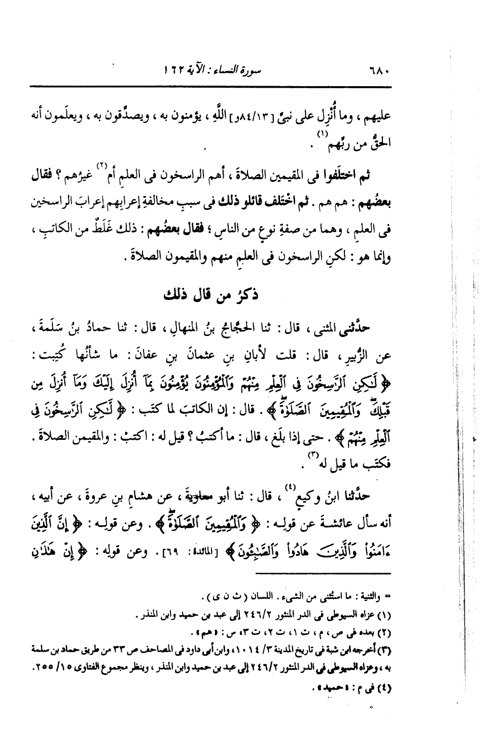 ذِكْرُ مَنْ قَالَ ذَلِكَ: حَدَّثَنِي الْمُثَنَّى , قَالَ: ثنا الْحَجَّاجُ بْنُ الْمِنْهَالِ , قَالَ: ثنا حَمَّادُ بْنُ سَلَمَةَ , عَنِ الزُّبَيْرِ , قَالَ: قُلْتُ لَأَبَانَ بْنِ عُثْمَانَ بْنِ عَفَّانَ: مَا شَأْنُهَا كُتِبَتْ {§لَكِنِ الرَّاسِخُونَ فِي الْعِلْمِ مِنْهُمْ وَالْمُؤْمِنُونَ يُؤْمِنُونَ بِمَا أُنْزِلَ إِلَيْكَ وَمَا أُنْزِلَ مِنْ قَبْلِكَ وَالْمُقِيمِينَ الصَّلَاةَ} [النساء: 162] قَالَ: " إِنَّ الْكَاتِبَ لَمَّا كَتَبَ {لَكِنِ الرَّاسِخُونَ فِي الْعِلْمِ مِنْهُمْ} [النساء: 162] حَتَّى إِذَا بَلَغَ قَالَ: مَا أَكْتُبُ؟ قِيلَ لَهُ اكْتُبْ {وَالْمُقِيمِينَ الصَّلَاةَ} [النساء: 162] فَكَتَبَ مَا قِيلَ لَهُ "