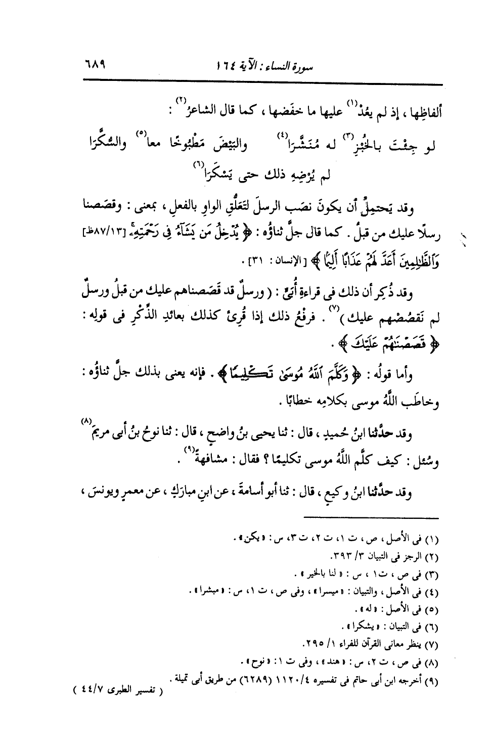 وَقَدْ يَحْتَمِلُ أَنْ يَكُونَ نَصَبَ الرُّسُلَ , لِتَعَلُّقِ الْوَاوِ بِالْفِعْلِ بِمَعْنَى: وَقَصَصْنَا رُسُلًا عَلَيْكَ مِنْ قَبْلُ , كَمَا قَالَ جَلَّ ثَنَاؤُهُ: {يُدْخِلُ مَنْ يَشَاءُ فِي رَحْمَتِهِ وَالظَّالِمِينَ أَعَدَّ لَهُمْ عَذَابًا أَلِيمًا} [الإنسان: 31] وَقَدْ ذُكِرَ أَنَّ ذَلِكَ فِي قِرَاءَةِ أُبَيٍّ: «وَرُسُلٌ قَدْ قَصَصْنَاهُمْ عَلَيْكَ مِنْ قَبْلُ وَرُسُلٌ لَمْ نَقْصُصْهُمْ عَلَيْكَ» فَرُفِعَ ذَلِكَ إِذَا قُرِئَ كَذَلِكَ بِعَائِدِ الذِّكْرِ فِي قَوْلِهِ: {قَصَصْنَاهُمْ عَلَيْكَ} [النساء: 164] وَأَمَّا قَوْلُهُ: {وَكَلَّمَ اللَّهُ مُوسَى تَكْلِيمًا} [النساء: 164] فَإِنَّهُ يَعْنِي بِذَلِكَ جَلَّ ثَنَاؤُهُ: وَخَاطَبَ اللَّهُ بِكَلَامِهِ مُوسَى خِطَابًا. وَقَدْ: