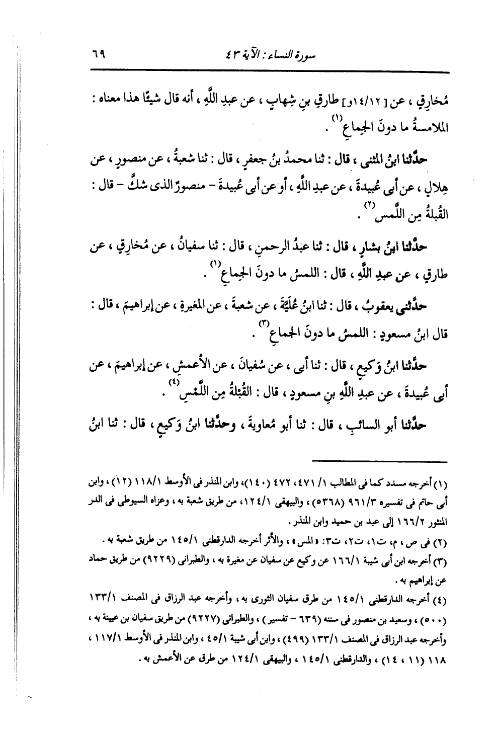 حَدَّثَنَا ابْنُ بَشَّارٍ قَالَ: ثنا عَبْدُ الرَّحْمَنِ قَالَ: ثنا سُفْيَانُ , عَنْ مُخَارِقٍ , عَنْ طَارِقٍ , عَنْ عَبْدِ اللَّهِ قَالَ: " §اللَّمْسُ: مَا دُونَ الْجِمَاعِ "