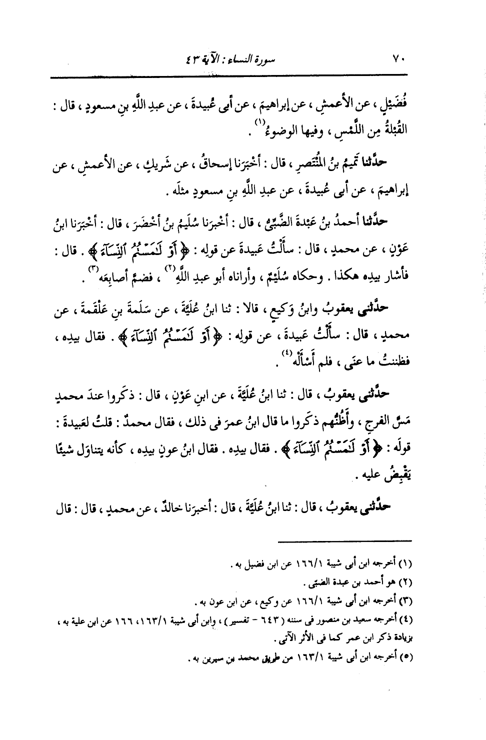حَدَّثَنِي يَعْقُوبُ وَابْنُ وَكِيعٍ قَالَا: ثنا ابْنُ عُلَيَّةَ , عَنْ سَلَمَةَ بْنِ عَلْقَمَةَ , عَنْ مُحَمَّدٍ قَالَ: سَأَلْتُ عَبِيدَةَ , عَنْ قَوْلِهِ: {§أَوْ لَامَسْتُمُ النِّسَاءَ} [النساء: 43] قَالَ بِيَدِهِ , فَظَنَنْتُ مَا عَنَى فَلَمْ أَسْأَلْهُ "