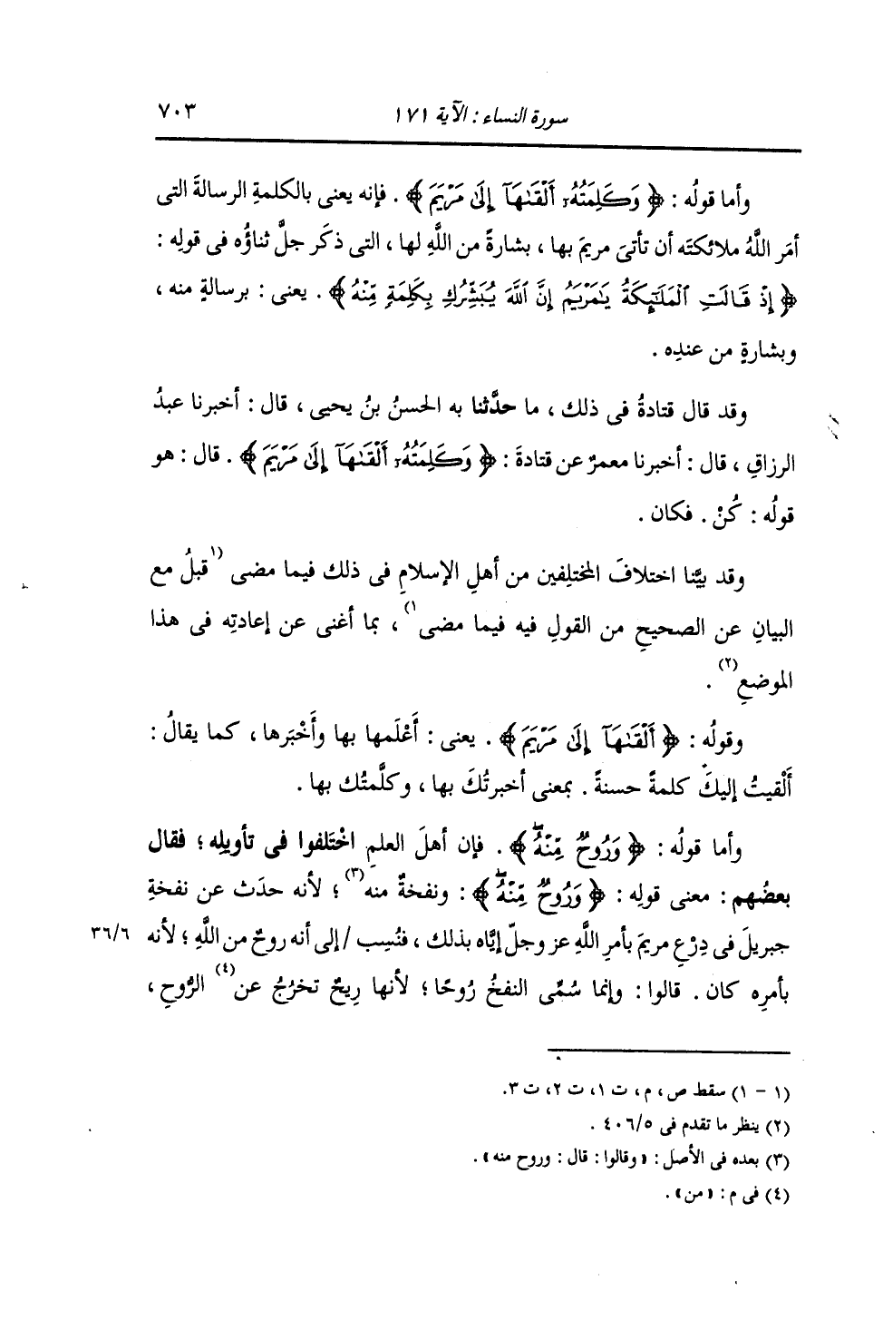 وَأَمَّا قَوْلُهُ: {وَكَلِمَتُهُ أَلْقَاهَا إِلَى مَرْيَمَ} [النساء: 171] فَإِنَّهُ يَعْنِي بِالْكَلِمَةَ: الرِّسَالَةَ الَّتِي أَمَرَ اللَّهُ مَلَائِكَتَهُ أَنْ تَأْتِيَ مَرْيَمَ بِهَا , بِشَارَةً مِنَ اللَّهِ لَهَا الَّتِي ذَكَرَ اللَّهُ جَلَّ ثَنَاؤُهُ فِي قَوْلِهِ: {إِذْ قَالَتِ الْمَلَائِكَةُ يَا مَرْيَمُ إِنَّ اللَّهَ يُبَشِّرُكِ بِكَلِمَةٍ مِنْهُ} [آل عمران: 45] يَعْنِي: بِرِسَالَةٍ مِنْهُ , وَبِشَارَةٍ مِنْ عِنْدِهِ وَقَدْ قَالَ قَتَادَةُ فِي ذَلِكَ مَا: