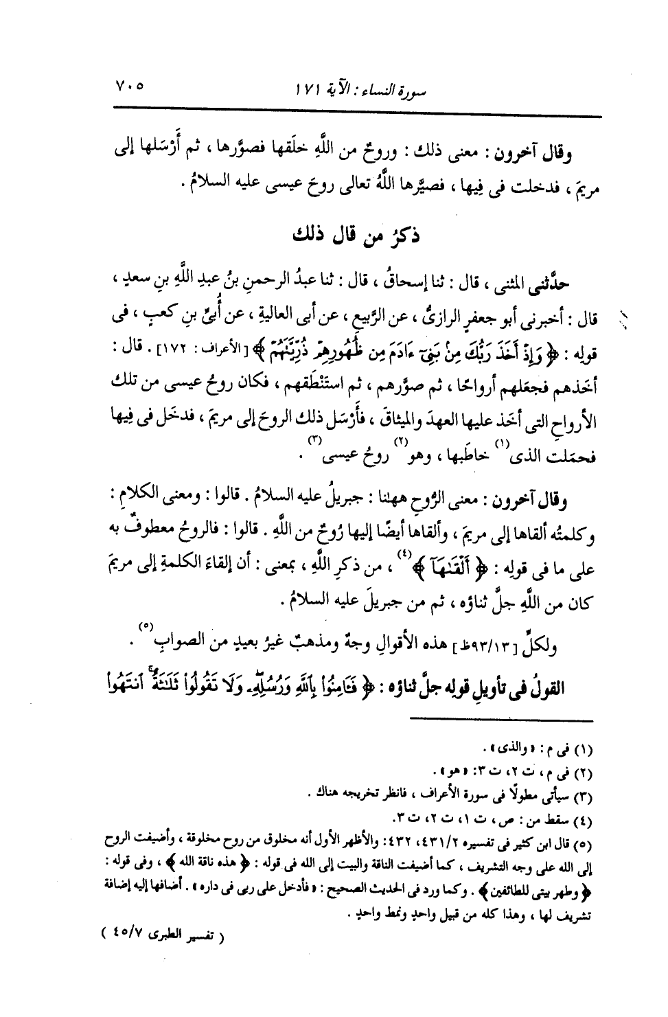 ذِكْرُ مَنْ قَالَ ذَلِكَ: حَدَّثَنِي الْمُثَنَّى , قَالَ: ثنا إِسْحَاقُ , قَالَ: ثنا عَبْدُ الرَّحْمَنِ بْنُ عَبْدِ اللَّهِ بْنِ سَعْدٍ , قَالَ: أَخْبَرَنِي أَبُو جَعْفَرٍ , عَنِ الرَّبِيعِ , عَنْ أَبِي الْعَالِيَةِ , عَنْ أُبَيِّ بْنِ كَعْبٍ , فِي قَوْلِهِ: {§وَإِذْ أَخَذَ رَبُّكَ مِنْ بَنِي آدَمَ مِنْ ظُهُورِهِمْ ذُرِّيَّتَهُمْ} [الأعراف: 172] قَالَ: «أَخَذَهُمْ فَجَعَلَهُمْ أَرْوَاحًا , ثُمَّ صَوَّرَهُمْ , ثُمَّ اسْتَنْطَقَهُمْ , فَكَانَ رُوحُ عِيسَى مِنْ تِلْكَ الْأَرْوَاحِ الَّتِي أَخَذَ عَلَيْهَا الْعَهْدَ وَالْمِيثَاقَ , فَأَرْسَلَ ذَلِكَ الرُّوحَ إِلَى مَرْيَمَ , فَدَخَلَ فِي فِيهَا فَحَمَلَتِ الَّذِي خَاطَبَهَا , وَهُوَ رُوحُ عِيسَى عَلَيْهِ السَّلَامُ» وَقَالَ آخَرُونَ: مَعْنَى الرُّوحِ هَهُنَا: جِبْرِيلُ عَلَيْهِ السَّلَامُ. قَالُوا: وَمَعْنَى الْكَلَامِ: وَكَلِمَتُهُ أَلْقَاهَا إِلَى مَرْيَمَ , وَأَلْقَاهَا أَيْضًا إِلَيْهَا رُوحٌ مِنَ اللَّهِ , ثُمَّ مِنْ جِبْرِيلَ عَلَيْهِ السَّلَامُ. ولِكُلِّ هَذِهِ الْأَقْوَالِ وَجْهٌ وَمَذْهَبٌ غَيْرُ بَعِيدٍ مِنَ الصَّوَابِ