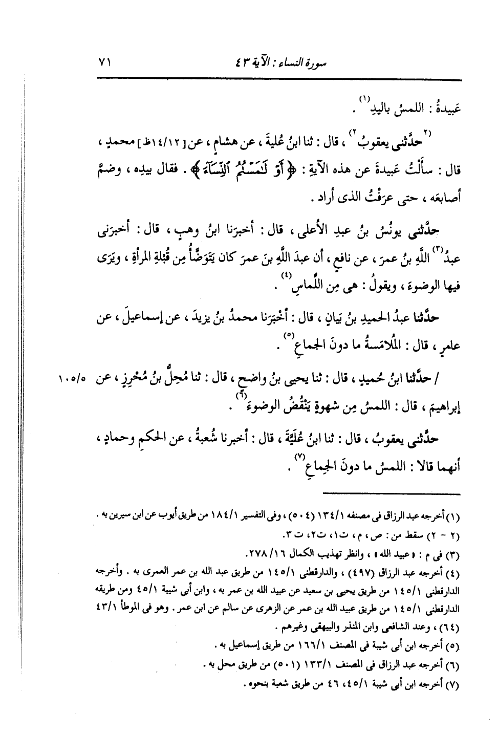 قَالَ: ثنا ابْنُ عُلَيَّةَ , عَنْ هِشَامٍ , عَنْ مُحَمَّدٍ قَالَ: سَأَلْتُ عَبِيدَةَ , عَنْ هَذِهِ الْآيَةِ: {§أَوْ لَامَسْتُمُ النِّسَاءَ} [النساء: 43] فَقَالَ بِيَدِهِ , وَضَمَّ أَصَابِعَهُ , حَتَّى عَرَفْتُ الَّذِي أَرَادَ "