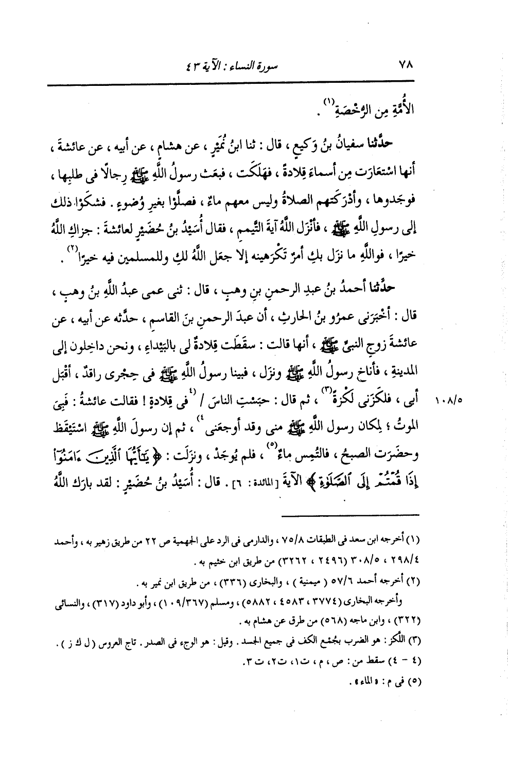 حَدَّثَنَا أَحْمَدُ بْنُ عَبْدِ الرَّحْمَنِ بْنِ وَهْبٍ قَالَ: ثني عَبْدُ اللَّهِ بْنُ وَهْبٍ قَالَ: أَخْبَرَنِي عَمْرُو بْنُ الْحَارِثِ أَنَّ عَبْدَ الرَّحْمَنِ بْنَ الْقَاسِمِ حَدَّثَهُ عَنْ أَبِيهِ , عَنْ عَائِشَةَ زَوْجِ النَّبِيِّ صَلَّى اللهُ عَلَيْهِ وَسَلَّمَ , أَنَّهَا قَالَتْ: سَقَطَتْ قِلَادَةٌ لِي بِالْبَيْدَاءِ وَنَحْنُ دَاخِلُونَ إِلَى الْمَدِينَةِ , فَأَنَاخَ رَسُولُ اللَّهِ صَلَّى اللهُ عَلَيْهِ وَسَلَّمَ وَنَزَلَ , فَبَيْنَا رَسُولُ اللَّهِ صَلَّى اللهُ عَلَيْهِ وَسَلَّمَ فِي حِجْرِي رَاقِدٌ , أَقْبَلَ أَبِي , فَلَكَزَنِي لَكْزَةً , ثُمَّ قَالَ: حَبَسْتِ النَّاسَ. ثُمَّ إِنَّ رَسُولَ اللَّهِ صَلَّى اللهُ عَلَيْهِ وَسَلَّمَ اسْتَيْقَظَ , وَحَضَرَتِ الصُّبْحُ , فَالْتُمِسَ الْمَاءُ فَلَمْ يُوجَدْ , وَنَزَلَتْ: {§يَا أَيُّهَا الَّذِينَ آمَنُوا إِذَا قُمْتُمْ إِلَى الصَّلَاةِ} [المائدة: 6] الْآيَةَ. قَالَ أُسَيْدُ بْنُ حُضَيْرٍ: لَقَدْ بَارَكَ اللَّهُ -[79]- لِلنَّاسِ فِيكُمْ يَا آلَ أَبِي بَكْرٍ , مَا أَنْتُمْ إِلَّا بَرَكَةً "