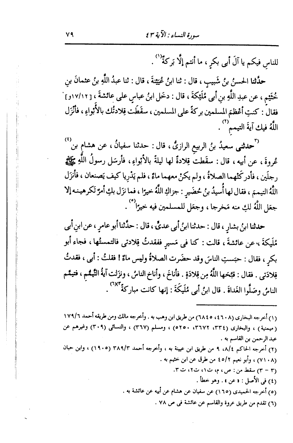 حَدَّثَنِي الْحَسَنُ بْنُ شَبِيبٍ , قَالَ: ثنا ابْنُ عُيَيْنَةَ , قَالَ: ثنا عَبْدُ اللَّهِ بْنُ عُثْمَانَ بنِ خُثَيْمٍ , عَنْ عَبْدِ اللَّهِ بْنِ أَبِي مُلَيْكَةَ , قَالَ: دَخَلَ ابْنُ عَبَّاسٍ عَلَى عَائِشَةَ , فَقَالَ: كُنْتِ أَعْظَمَ الْمُسْلِمِينَ بَرَكَةً عَلَى الْمُسْلِمِينَ؛ سَقَطَتْ قِلَادَتُكِ بِالْأَبْوَاءِ §فَأَنْزَلَ اللَّهُ فِيكِ آيَةَ التَّيَمُّمِ " -[80]- وَاخْتَلَفَ الْقُرَّاءُ فِي قِرَاءَةِ قَوِلِهِ: {أَوْ لَامَسْتُمُ النَّسَاءَ} [النساء: 43] . فَقَرَأَ ذَلِكَ عَامَةُ قُرَّاءُ أَهْلِ الْمَدِينَةِ وَبَعْضُ الْبَصْرِيِّينَ وَالْكُوفِيِّينَ: {أَوْ لَامَسْتُمُ} [النساء: 43] بِمَعْنَى: أَوْ لَمَسْتُمْ نِسَاءَكُمْ وَلَمَسَتْكُمْ. وَقَرَأَ ذَلِكَ عَامَةُ قَرَّاءِ الْكُوفِيِّينَ: «أَوْ لَمَسْتُمُ النِّسَاءَ» بِمَعْنَى: أَوْ لَمَسْتُمْ أَنْتُمْ أَيُّهَا الرِّجَالُ نِسَاءَكُمْ، وَهُمَا قِرَاءَتَانِ مُتَقَارِبَتَا الْمَعْنَى، لِأَنَّهُ لَا يَكُونُ الرَّجُلُ لَامِسًا امْرَأَتَهُ إِلَّا وَهِيَ لَامَسَتْهُ، فَالْلَمْسُ فِي ذَلِكَ يَدُلُّ عَلَى مَعْنَى اللِّمَاسِ، وَاللِّمَاسُ عَلَى مَعْنَى اللَّمْسِ مِنْ كُلِّ وَاحِدٍ مِنْهُمَا صَاحِبَهُ، فَبِأَيِّ الْقِرَاءَتَيْنِ قَرَأَ ذَلِكَ الْقَارِئُ فَمُصِيبٌ لاتِّفَاقِ مَعَنَيَيْهِمَا