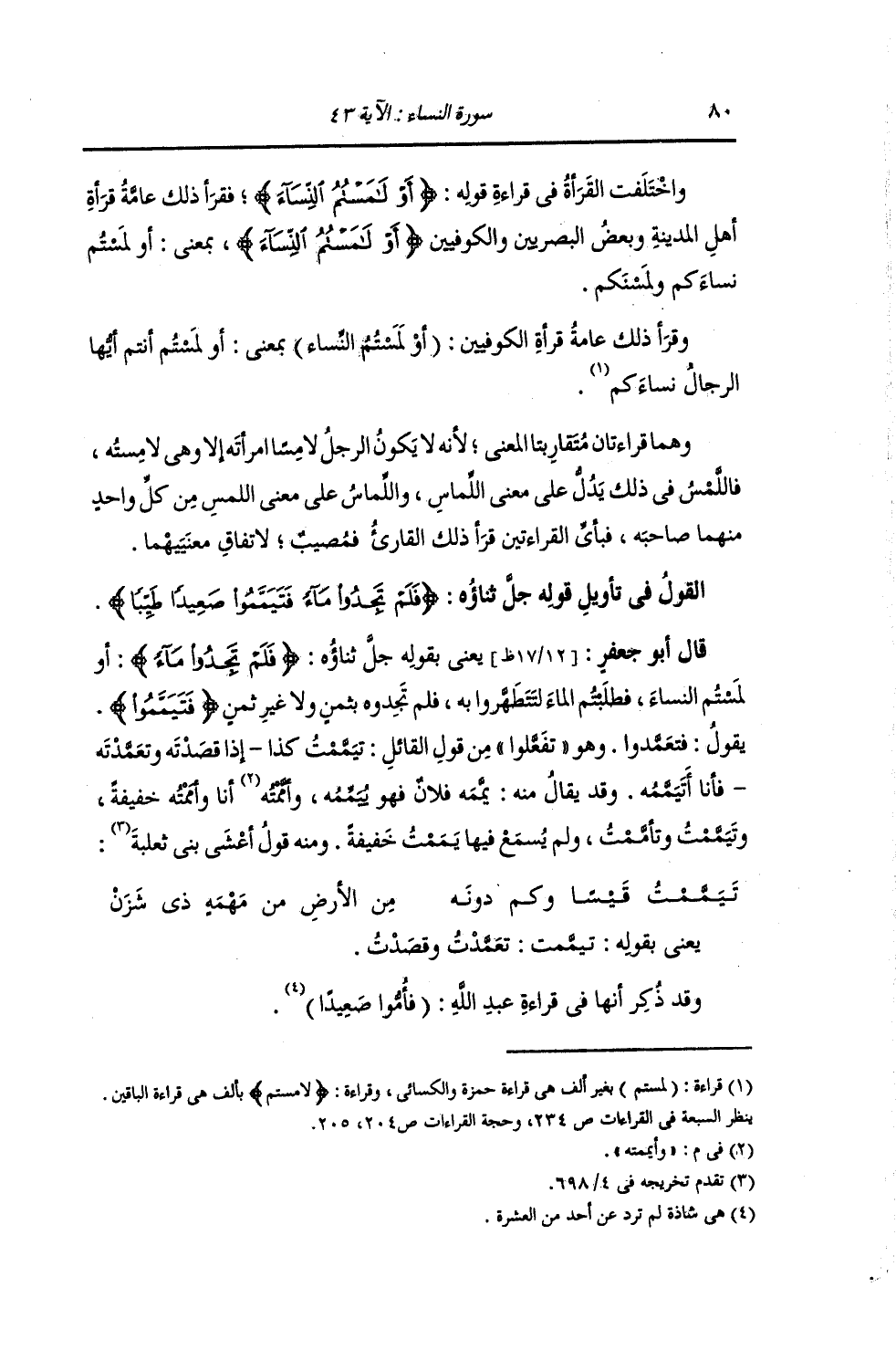 §الْقَوْلُ فِي تَأْوِيلِ قَوْلِهِ تَعَالَى: {فَلَمْ تَجِدُوا مَاءً فَتَيَمَّمُوا صَعِيدًا طَيِّبًا} [النساء: 43] يَعْنِي بِقَوْلِهِ جَلَّ ثَنَاؤُهُ: {فَلَمْ تَجِدُوا مَاءً} [النساء: 43] أَوْ لَمَسْتُمُ النِّسَاءَ , فَطَلَبْتُمُ الْمَاءَ لِتَتَطَهَّرُوا بِهِ , فَلَمْ تَجِدُوهُ بِثَمَنٍ وَلَا غَيْرِ ثَمَنٍ {فَتَيَمَّمُوا} [النساء: 43] يَقُولُ: " فَتَعَمَّدُوا , وَهُوَ تَفَعَّلُوا مِنْ قَوْلِ الْقَائِلِ: تَيَمَّمْتُ كَذَا: إِذَا قَصَدْتُهُ وَتَعَمَّدْتُهُ فَأَنَا أَتَيَمَّمُهُ , وَقَدْ يُقَالَ مِنْهُ: يَمَّمَهُ فُلَانٌ فَهُوَ يُيَمِّمُهُ , وَأَيْمَمْتُهُ أَنَا وَأَمَمْتُهُ خَفِيفَةً , وَتَيَمَّمْتُ وَتَأَمَّمْتُ , وَلَمْ يُسْمَعْ فِيهَا يَمَمْتُ خَفِيفَةً. وَمِنْهُ قَوْلُ أَعْشَى بَنِي ثَعْلَبَةَ: