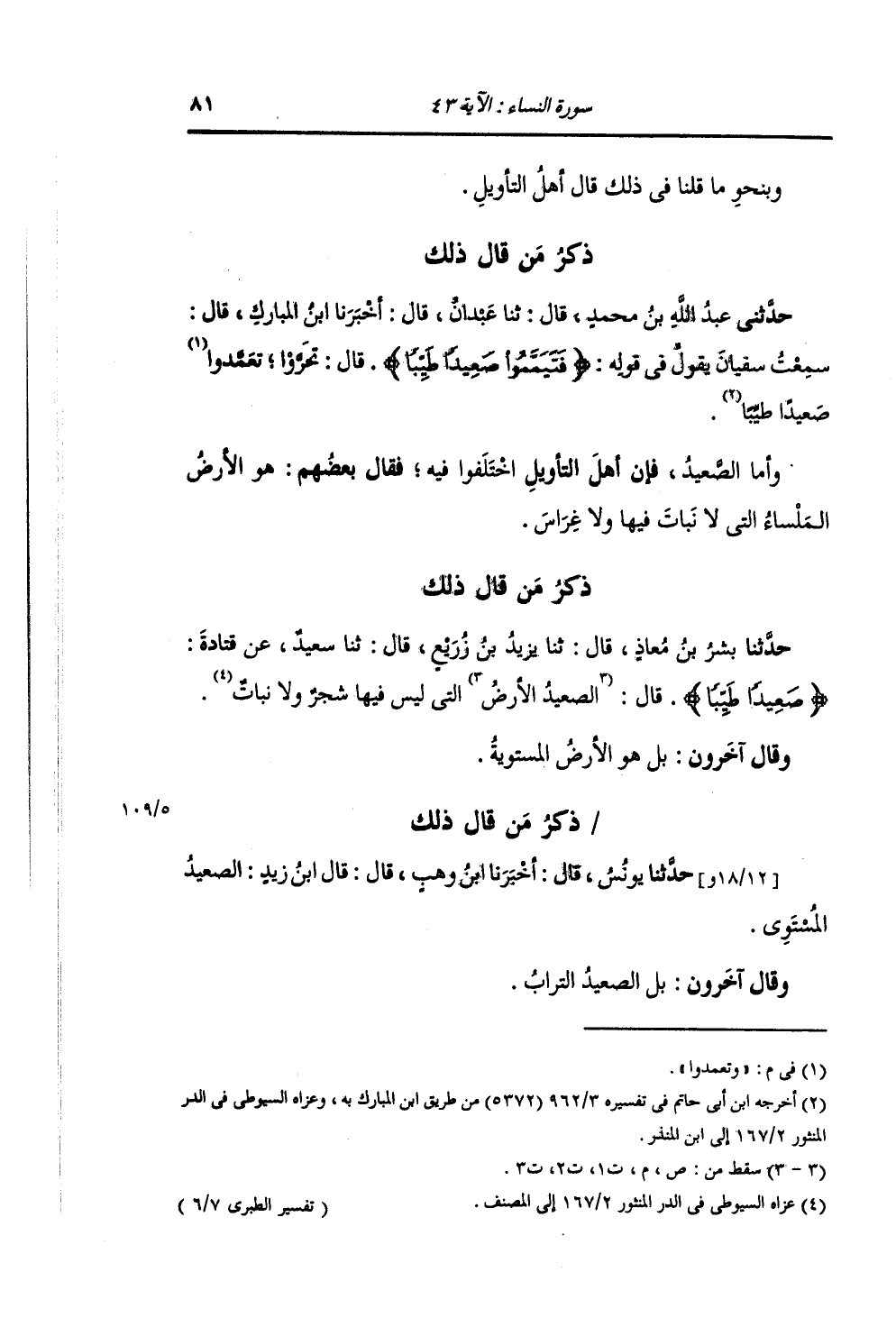 ذِكْرُ مَنْ قَالَ ذَلِكَ: حَدَّثَنِي عَبْدُ اللَّهِ بْنُ مُحَمَّدٍ , قَالَ: ثنا عَبْدَانُ , قَالَ: أَخْبَرَنَا ابْنُ الْمُبَارَكِ , قَالَ: سَمِعْتُ سُفْيَانَ , يَقُولُ فِي قَوْلِهِ: §فَتَيَمَّمُوا صَعِيدًا طَيِّبًا قَالَ: «تَحَرَّوْا وَتَعَمَّدُوا صَعِيدًا طَيِّبًا» وَأَمَّا الصَّعِيدُ , فَإِنَّ أَهْلَ التَّأْوِيلِ اخْتَلَفُوا فِيهِ , فَقَالَ بَعْضُهُمْ: هُوَ الْأَرْضُ الْمَلْسَاءُ الَّتِي لَا نَبَاتَ فِيهَا وَلَا غِرَاسَ