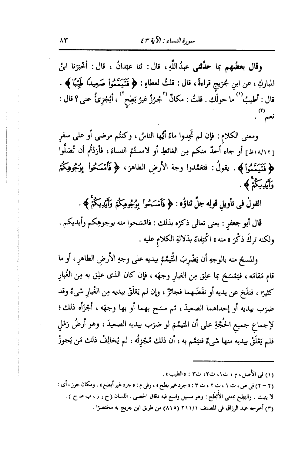 §الْقَوْلُ فِي تَأْوِيلِ قَوْلِهِ تَعَالَى: {فَامْسَحُوا بِوُجُوهِكُمْ وَأَيْدِيكُمْ} [النساء: 43] يَعْنِي بِذَلِكَ جَلَّ ثَنَاؤُهُ: فَامْسَحُوا مِنْهُ بِوُجُوهِكُمْ وَأَيْدِيكُمْ , وَلَكِنَّهُ تَرَكَ ذِكْرَ مِنْهُ اكْتِفَاءً بِدَلَالَةِ الْكَلَامِ عَلَيْهِ. وَالْمَسْحُ مِنْهُ بِالْوَجْهِ أَنْ يَضْرِبَ الْمُتَيَمِّمُ بِيَدَيْهِ عَلَى وَجْهِ الْأَرْضِ الطَّاهِرِ , أَوْ مَا قَامَ مَقَامَهُ , فَيَمْسَحَ بِمَا عَلَقَ مِنَ الْغُبَارِ وَجْهَهُ , فَإِنْ كَانَ الَّذِي عَلَقَ بِهِ الْغُبَارُ كَثِيرًا , فَنَفَخَ عَنْ يَدَيْهِ أَوْ نَفَضَهُ , فَهُوَ جَائِزٌ. وَإِنْ لَمْ يَعْلَقْ بِيَدَيْهِ مِنَ الْغُبَارِ شَيْءٌ , وَقَدْ ضَرَبَ بِيَدَيْهِ أَوْ إِحْدَاهُمَا الصَّعِيدَ , ثُمَّ مَسَحَ بِهِمَا أَوْ بِهَا وَجْهَهُ أَجْزَأَهُ ذَلِكَ , لِإِجْمَاعِ جَمِيعِ الْحُجَّةِ عَلَى أَنَّ الْمُتَيَمِّمَ لَوْ ضَرَبَ بِيَدَيْهِ الصَّعِيدَ وَهُوَ أَرْضُ رَمْلٍ فَلَمْ يَعْلَقْ بِيَدَيْهِ مِنْهَا شَيْءٌ فَتَيَمَّمَ بِهِ أَنَّ ذَلِكَ مُجْزِئُهُ , لَمْ يُخَالِفْ ذَلِكَ مَنْ يُجَوِّزُ