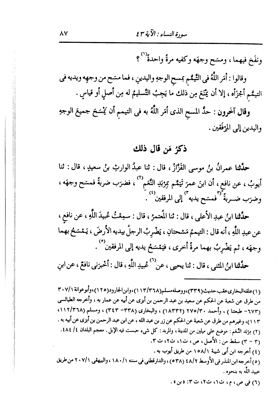 ذِكْرُ مَنْ قَالَ ذَلِكَ: حَدَّثَنَا عِمْرَانُ بْنُ مُوسَى الْقَزَّازُ , قَالَ: ثنا عَبْدُ الْوَارِثِ بْنُ سَعِيدٍ , قَالَ: ثنا أَيُّوبُ , عَنْ نَافِعٍ: أَنَّ ابْنَ عُمَرَ , تَيَمَّمَ بِمَرْبَدِ النَّعَمِ , §فَضَرَبَ ضَرْبَةً فَمَسَحَ وَجْهَهُ , وَضَرَبَ ضَرْبَةً فَمَسَحَ يَدَيْهِ إِلَى الْمِرْفَقَيْنِ "