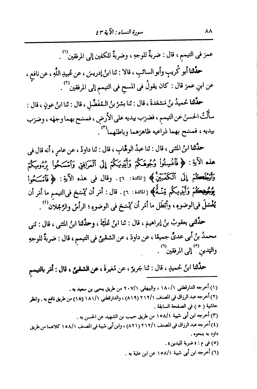 حَدَّثَنَا حُمَيْدُ بْنُ مَسْعَدَةَ , قَالَ: ثنا بِشْرُ بْنُ الْمُفَضَّلِ , قَالَ: ثنا ابْنُ عَوْنٍ , قَالَ: سَأَلْتُ الْحَسَنَ عَنِ التَّيَمُّمِ , §فَضَرَبَ بِيَدَيْهِ عَلَى الْأَرْضِ فَمَسَحَ بِهِمَا وَجْهَهُ , وَضَرَبَ بِيَدَيْهِ فَمَسَحَ بِهِمَا ذِرَاعَيْهِ ظَاهِرَهُمَا وَبَاطِنَهُمَا "