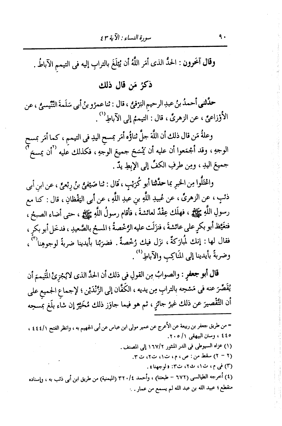 ذِكْرُ مَنْ قَالَ ذَلِكَ: حَدَّثَنِي أَحْمَدُ بْنُ عَبْدِ الرَّحِيمِ الْبَرْقِيُّ , قَالَ: ثنا عُمَرُ بْنُ أَبِي سَلَمَةَ التِّنِّيسِيُّ , عَنِ الْأَوْزَاعِيِّ , عَنِ الزُّهْرِيِّ , قَالَ: «§التَّيَمُّمُ إِلَى الْآبَاطِ» وَعِلَّةُ مَنْ قَالَ ذَلِكَ أَنَّ اللَّهَ أَمَرَ بِمَسْحِ الْيَدِ فِي التَّيَمُّمِ كَمَا أَمَرَ بِمَسْحِ الْوَجْهِ , وَقَدِ اجْمَعُوا أَنَّ عَلَيْهِ أَنْ يَمْسَحَ جَمِيعَ الْوَجْهِ , فَكَذَلِكَ عَلَيْهِ جَمِيعُ الْيَدِ , وَمِنْ طَرَفِ الْكَفِّ إِلَى الْإبْطِ يَدٌ. وَاعْتَلُّوا مِنَ الْخَبَرِ بِمَا:
