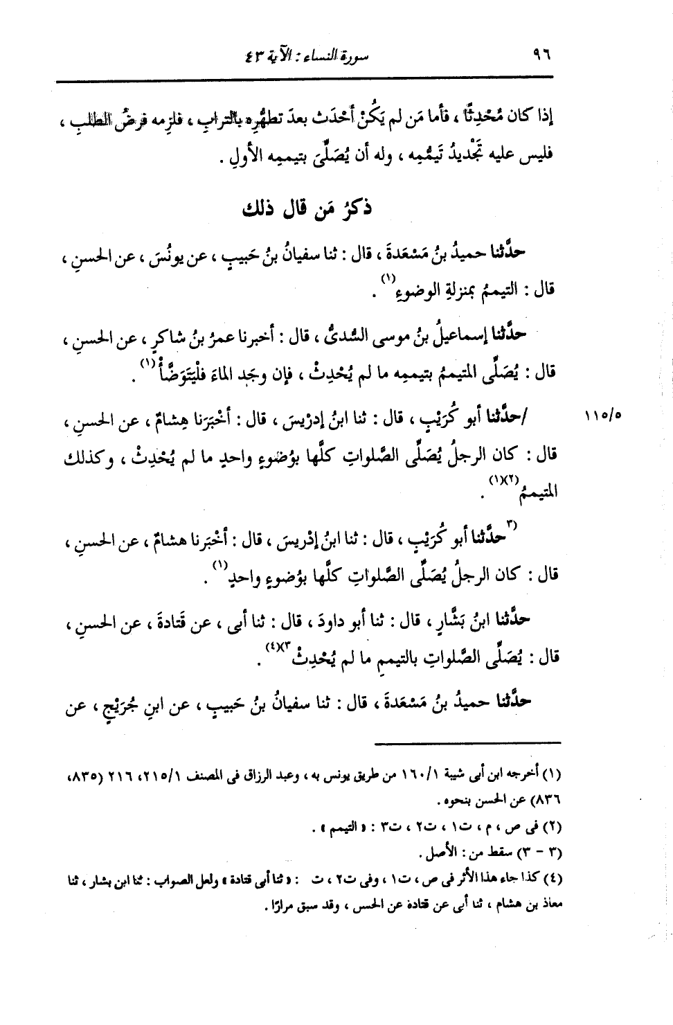 ذِكْرُ مَنْ قَالَ ذَلِكَ: حَدَّثَنَا حُمَيْدُ بْنُ مَسْعَدَةَ , قَالَ: ثنا سُفْيَانُ بْنُ حَبِيبٍ , عَنْ يُونُسَ , عَنِ الْحَسَنِ , قَالَ: «§التَّيَمُّمُ بِمَنْزِلَةِ الْوُضُوءِ»