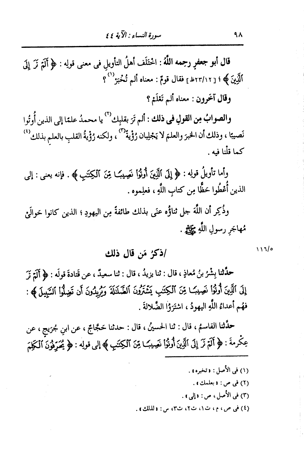 اخْتَلَفَ أَهْلُ التَّأْوِيلِ فِي مَعْنَى قَوْلِهِ جَلَّ ثَنَاؤُهُ: {أَلَمْ تَرَ إِلَى الَّذِينَ} [البقرة: 243] فَقَالَ قَوْمٌ: مَعْنَاهُ: أَلَمْ تُخْبَرْ , وَقَالَ آخَرُونَ: مَعْنَاهُ: أَلَمْ تَعْلَمْ. وَالصَّوَابُ مِنَ الْقَوْلِ فِي ذَلِكَ: أَلَمْ تَرَ بِقَلْبِكَ يَا مُحَمَّدُ عِلْمًا إِلَى الَّذِينَ أُوتُوا نَصِيبًا. وَذَلِكَ أَنَّ الْخَبَرَ وَالْعِلْمَ لَا يُجَلِّيَانِ رُؤْيَةً , وَلَكِنَّهُ رُؤْيَةُ الْقَلْبِ بِالْعِلْمِ لِذَلِكَ كَمَا قُلْنَا فِيهِ. وَأَمَّا تَأْوِيلُ قَوْلِهِ: {إِلَى الَّذِينَ أُوتُوا نَصِيبًا مِنَ الْكِتَابِ} [آل عمران: 23] فَإِنَّهُ يَعْنِي: إِلَى الَّذِينَ أُعْطُوا حَظًّا مِنْ كِتَابِ اللَّهِ , فَعَلِمُوهُ. وذَكَرَ أَنَّ اللَّهَ عَنَى بِذَلِكَ طَائِفَةً مِنَ الْيَهُودِ الَّذِينَ كَانُوا حَوَالَيْ مُهَاجَرِ رَسُولِ اللَّهِ صَلَّى اللهُ عَلَيْهِ وَسَلَّمَ "