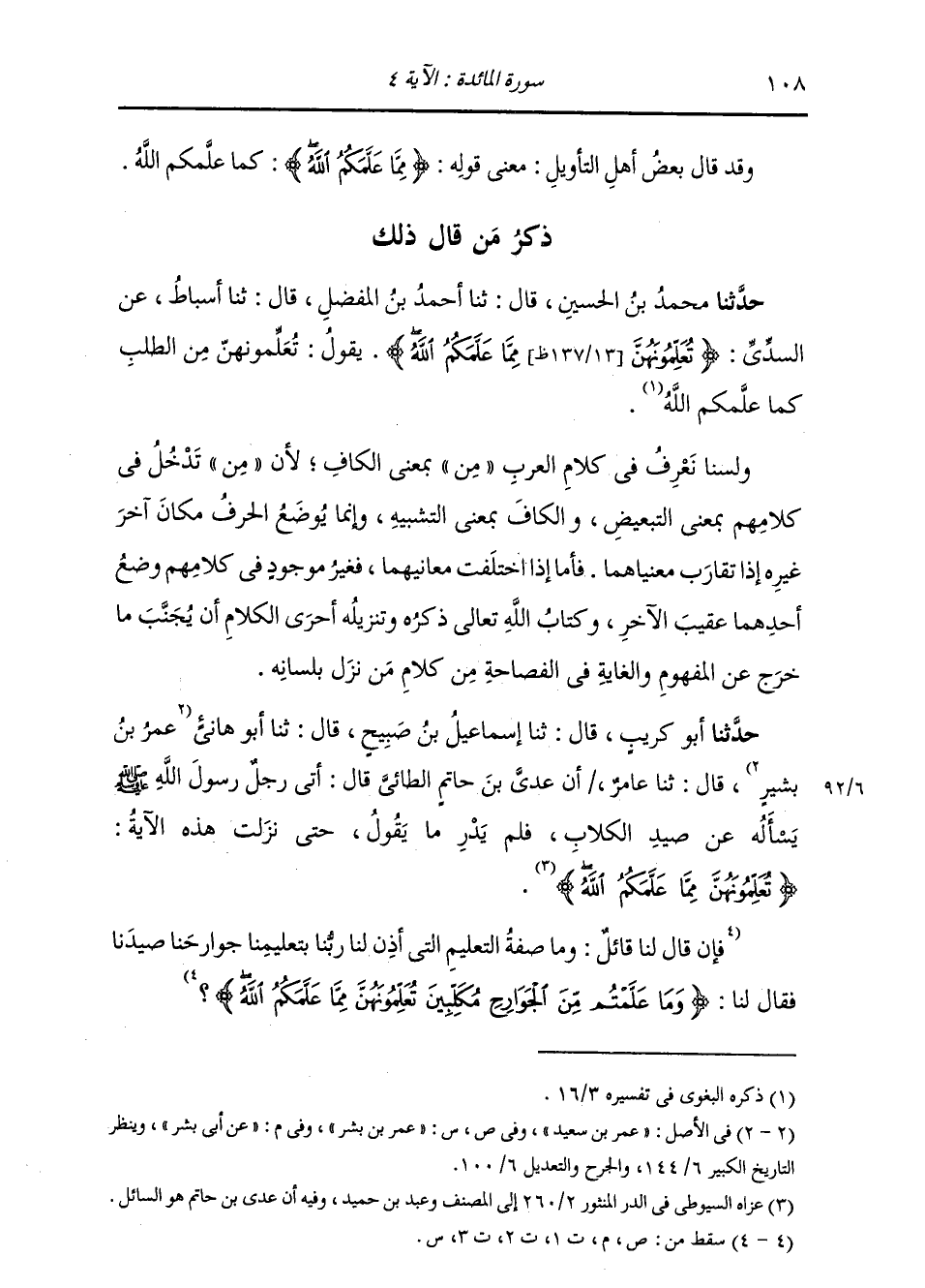 ذِكْرُ مَنْ قَالَ ذَلِكَ: حَدَّثَنَا مُحَمَّدُ بْنُ الْحُسَيْنِ , قَالَ: ثنا أَحْمَدُ بْنُ الْمُفَضَّلِ , قَالَ: ثنا أَسْبَاطٌ , عَنِ السُّدِّيِّ: {§تُعَلِّمُونَهُنَّ مِمَّا عَلَّمَكُمُ اللَّهُ} [المائدة: 4] يَقُولُ: «تُعَلِّمُونَهُنَّ مِنَ الطَّلَبِ كَمَا عَلَّمَكُمُ اللَّهُ» وَلَسْنَا نَعْرِفُ فِي كَلَامِ الْعَرَبِ مِنْ بِمَعْنَى الْكَافِ , لِأَنَّ مِنْ تَدْخُلُ فِي كَلَامِهِمْ بِمَعْنَى التَّبْعِيضِ , وَالْكَافُ بِمَعْنَى التَّشْبِيهِ. وَإِنَّمَا يُوضَعُ الْحَرْفُ مَكَانَ آخَرَ غَيْرِهِ إِذَا تَقَارَبَ مَعْنَيَاهُمَا , فَأَمَّا إِذَا اخْتَلَفَتْ مَعَانِيهُمَا فَغَيْرُ مَوْجُودٍ فِي كَلَامِهِمْ وَضْعُ أَحَدِهِمَا عُقَيْبَ الْآخَرَ , وَكِتَابُ اللَّهِ وَتَنْزِيلُهُ أَحْرَى الْكَلَامِ أَنْ يُجَنَّبَ مَا خَرَجَ عَنِ الْمَفْهُومِ وَالْغَايَةِ فِي الْفَصَاحَةِ مِنْ كَلَامِ مَنْ نَزَلِ بِلِسَانِهِ